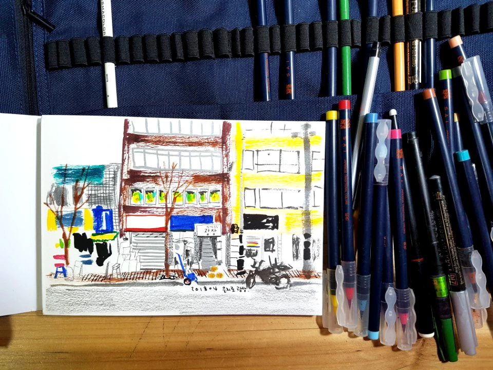 늘어선 타일과 도기, 도로 면에는 조명가게들이 즐비해 있고 철물점과 건재들이 꽉꽉 들어차 있었다. 좁은 골목에는 지류회사들의 팔레트를 옮기기 위한 지게차들과 퀵서비스 오토바이가 뒤엉켜 내내 빵빵, 삑삑 소리로 가득찬 골목이 있었다. 중장년층으로 가득차 담배연기가 끊임없이 흩날리고, 낡은 건물들 입구에 삘딍이라고 쓰여진 오래된 현판과 그곳에 기록된 70년대를 표시한 숫자들은 소위 뜨는 동네와는 다른 매력으로 다가왔다. 크고 새롭게 지어진 빌딩숲 뒤편의 낮고 낡은 건물로 가득 찬 동네, 서울 중심에 이런 곳이 있었나 할만큼 첫 눈에 반하고 말았다.