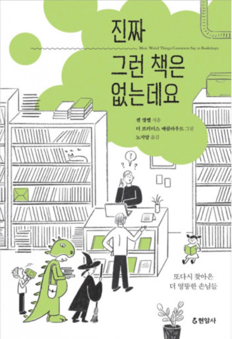 저자가 대처하는 방법을 보면서 대리만족도 느껴보고, 또 비슷한 유형을 만나봤다면 공감도 해보세요. “그래! 내가 예민하거나 이상한 게 아니라 ‘이상한 사람’은 어디에나 있으니 툭툭 털어버리자.”하고 마음 다잡으시거나. “나도 이렇게 기록해봐야지! 나중에 출판할 수도 있으니까!”라고 생각할 수도 있겠네요. 웃기기도 하고 날카롭기도 한 책을 살랑살랑 넘기면서 물주먹 님의 마음도 살살 주물러 주세요. 무례한 사람도 있지만, 물주먹 님의 작품을 좋아하고 묵묵히 응원하는, 보이지 않는 혹은 튀지 않는 구매자와 팬이 많다는 것도 잊지 마시고요. 젠 캠벨도 온갖 기상천외한 손님을 다 만나면서도 꾸준히 책방에서 일하며 『진짜 그런 책은 없는데요』(현암사, 2019)라는 후속작도 냈답니다. 후속작에서는 서점에서 피자를 시키는 손님도 있더라고요(소곤소곤)