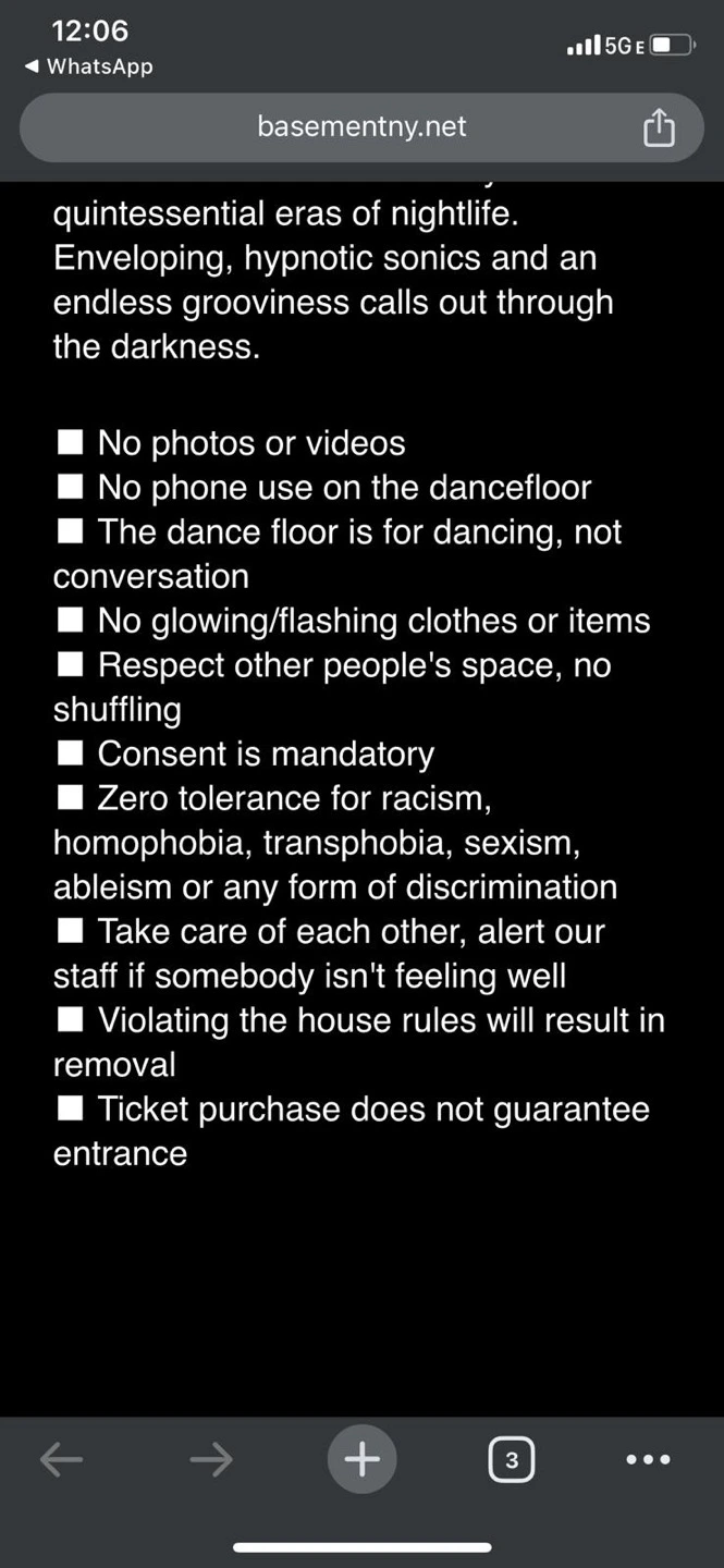 그러나 내가 누구인가. 금요일에 약속이 없으면 누구보다 불안해하는 중증 ‘금요일엔 무조건 나가 놀아야 해’ 강박증 환자였다. 결국엔 고민 끝에 마땅한 대안(?)이 생기지 않아 안 가본 클럽에 가본다는 것에 의의를 두자고 결심하고 금요일 공연 티켓을 샀다. 그런데 그 클럽이 알아볼수록 심상치 않았다. Basement는 브루클린에서도 번화가와 멀리 떨어진 곳에 있었는데 접근성이 안 좋은 것 치고 상당히 까다로운 것으로 정평이 나 있었다. 기본적으로 홈페이지에 적혀있는 ‘하우스 룰’이 10개 이상인데, 그중 도드라지는 것은 다음과 같다.