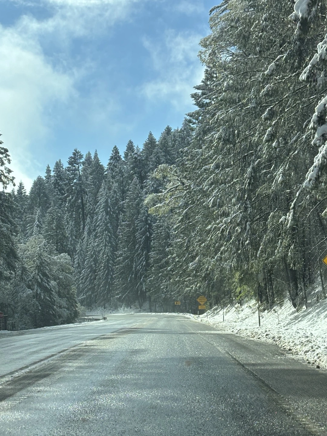 다음날 일어나자마자 도로 상황을 확인해 보니 다행히도 도로 통제는 풀린 듯했지만 뜻밖에 이중으로 지불하게 된 숙소비와 지체된 시간에 속이 쓰렸다. 조금이나마 빨리 도착하기 위해 열심히 속도를 내는데 눈앞에 눈이 부실 정도의 순백의 눈을 잔뜩 얹고 있는 침엽수림이 나타났다.
