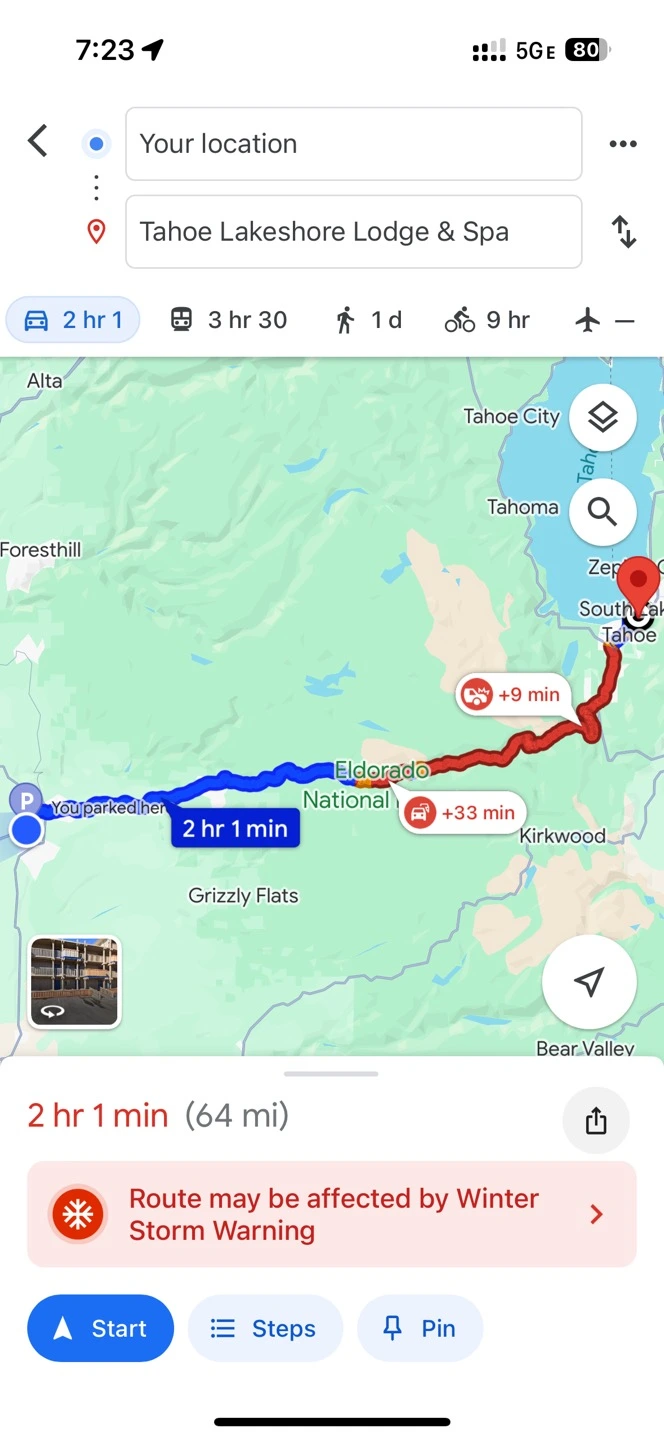 보통 샌프란시스코에서 세 시간 반 정도 동쪽으로 가면 도착하는 거리라 열심히 고속도로에서 액셀을 밟고 있었는데, 한 시간 반 정도 지점을 지나자 이상하게 아무리 달려도 남은 시간이 줄지 않았고 어느 시점부터는 오히려 늘어나기 시작했다. 황급히 구글맵을 살펴보는데 극심한 혼잡을 나타내는 빨간색이 우리가 가야 하는 도로 위에 드리웠다. 그리고 정체의 원인은 다름 아닌 Snow storm, 즉 폭설이었다. 타호가 스키로 유명한 지역인 건 알았지만 5월에 폭설주의보를 만나리라고는 상상도 못 했던지라 상황을 파악하기 위해 고속도로 근처 한 호텔에 차를 댔다.