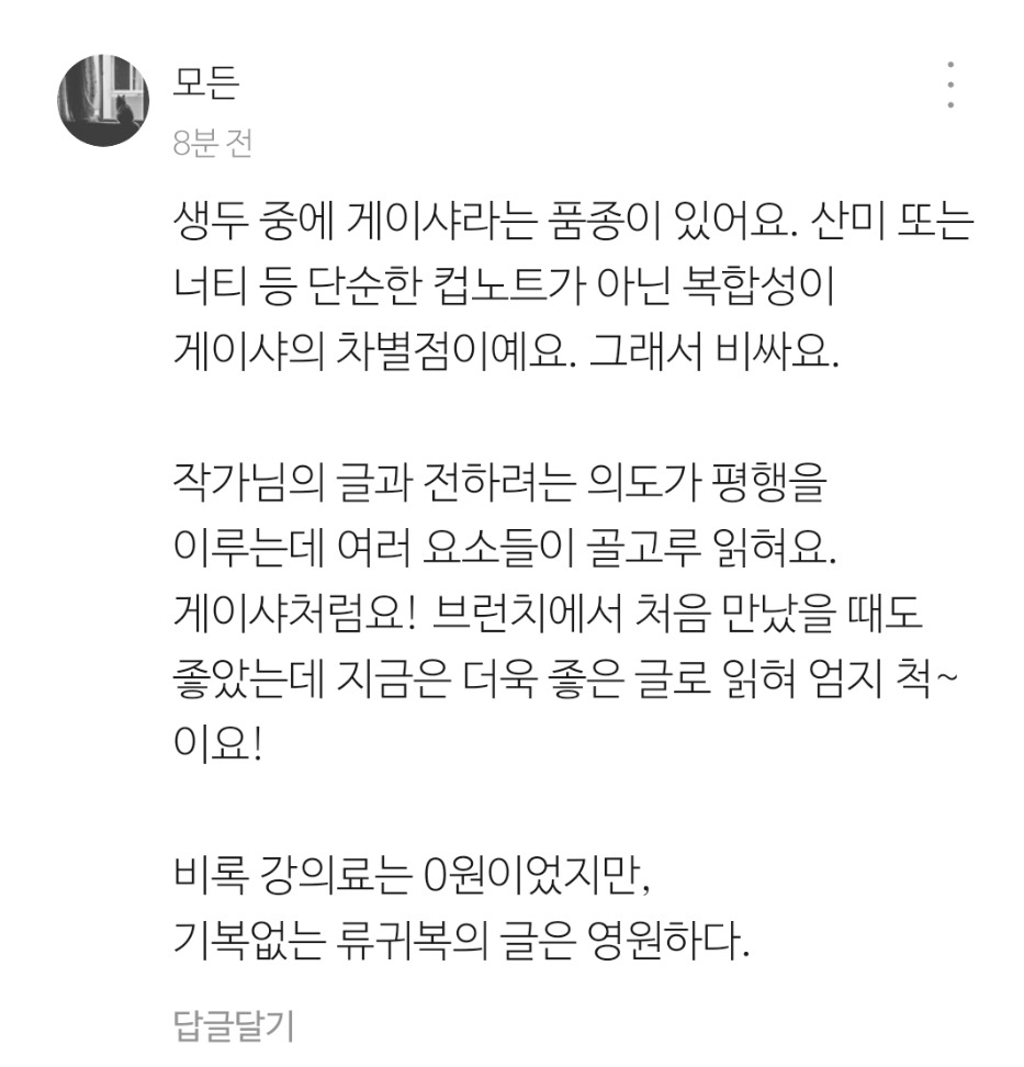 귀인이 인천에 카페를 오픈했다. 유퀴즈 스타일의 류퀴즈 형식으로 북토크를 준비하겠다는 그의 제안을 받자마자 유느님을 만나는 심정으로 얼른 일정을 비웠다. 그리고 이번 주 토요일에 그를 만나러 간다. “준비 없이 편하게 오세요”라는 그의 말을 믿고 정말 편하게 갈 계획을 세웠다. 어떤 하루가 펼쳐질지 궁금한데, 한 가지는 확실히 알겠다. 오묘의 커피는 그가 남긴 댓글만큼이나 강렬히 내 기억에 저장될 거라 믿는다. 저장 중인 2번째 댓글은 광교도서관 북토크 후기에 남겨진 글이다. 한 글자씩 읽다 보면 마시기도 전부터 커피를 음미하게 된다.