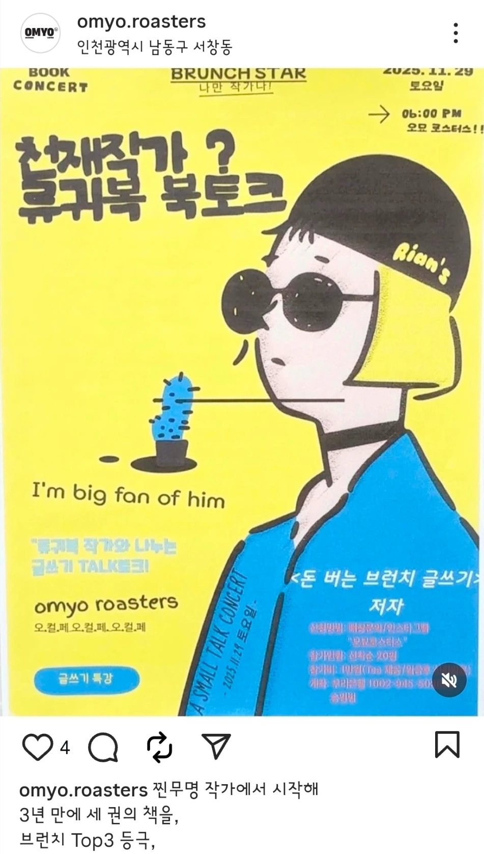 그가 브런치에 올린 북토크 모집 안내를 보니 댓글이 0개다. '어라? 이건 뭐지?'라는 생각이 드는데, 하단에 인스타를 참고하라고 적혀있다. 남다른 필력을 소유한 모든 작가는 엄청난 인플루언서였던 게 분명하다. 귀가와 동시에 아내의 도움을 받아 피드를 확인했다(나는 스마트폰에 인스타가 없다). 모집 안내 글을 보니 선착순 20명이다. 스케일을 보니, 예상대로 팔로워 수가 엄청난 거 같다. ‘만석이 되어 카페 밖까지 줄이 이어지면 어떻게 하지?’라는 기대감을 품고 아내에게 팔로워 수를 물어보니 허망한 답이 돌아온다. 놀라지 마시라. 오묘 로스터스의 인스타 팔로워는 무려 60명이다. 60만 명이 아니고, 6만 명도 아니고, 심지어 600명도 아닌, 정확히 60명이다. 전체 팔로워의 1/3이 참석해야 그날 정원이 찰 거 같다. 이대로면 2명도 힘들 거 같다. 결국 나는 편하게 가지 못하고 직접 참석자를 모집하는 선택을 한다. 개업 선물(?)로 카페 홍보도 남길 겸 하여 주인장을 대신하여 손님이 손님을 초빙하는 글을 남긴다.