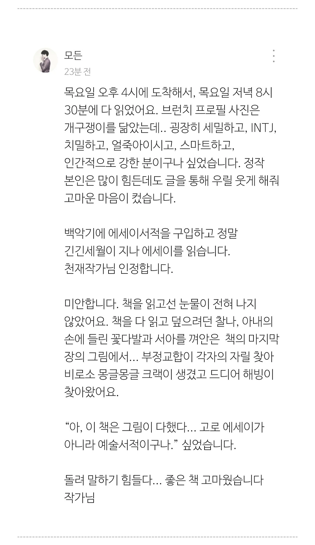 그의 필명은 ‘모든’이다. 강인하고 부드러우면서도 강렬한 필체를 구사하는 언어의 마술사다. 브런치에는 예술가 감성이 묻어나는 글을 쓴다. 이따금 나는 댓글을 캡처하여 ‘집필 폴더’ 란에 보관하는데, 모든 작가만이 유일하게 2칸을 차지하고 있다. 그가 나의 첫 책 《나는 행복을 촬영하는 방사선사입니다》를 읽고 남긴 댓글을 지금도 종종 꺼내 읽는다.