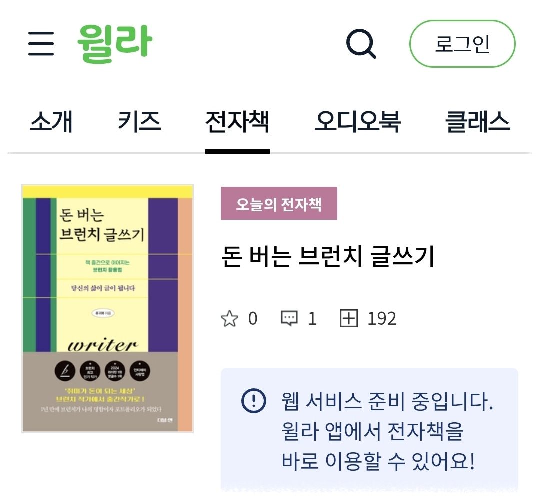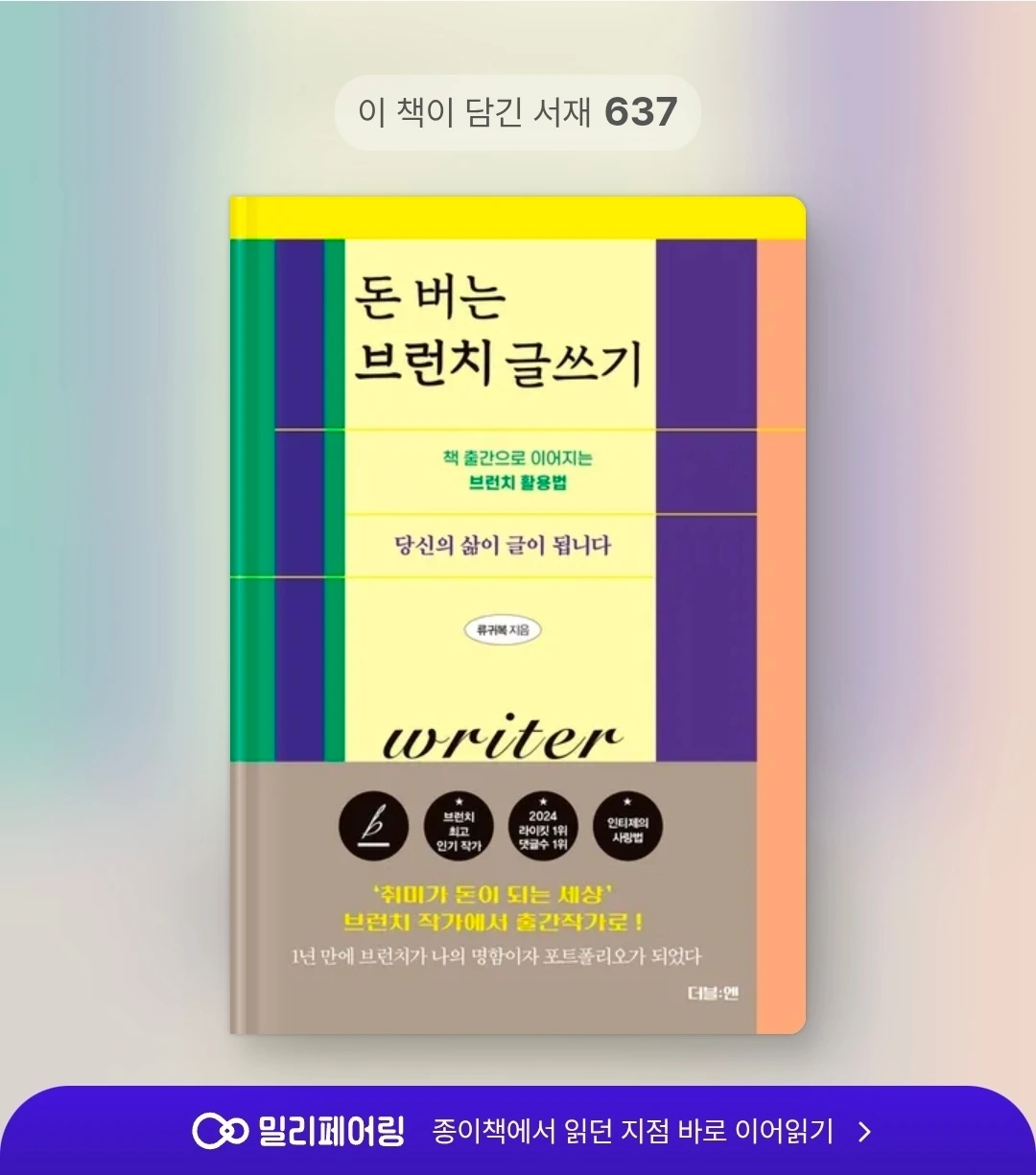 첫 책 《나는 행복을 촬영하는 방사선사입니다》는 종이책으로만 발간했다. 막상 내 상황이 되고 보니 약간의 아쉬움이 남았다. 팔리는 글은 독자를 만나야 의미가 생긴다. 인세 수입을 떠나 '전자책을 즐기는 독자에게 좋은 글을 소개하고 나를 알리는 기회를 놓쳤다'라는 생각이 들었다. 더구나 '또 다른 일상 이야기' 시리즈는 성인들만 읽는다. 안타까운 마음을 지울 수가 없었다. 두 번째 출간 때는 달랐다. 더블:엔 출판사는 트렌드에 맞게 전자책을 출간한다. 《돈 버는 브런치 글쓰기》는 종이책 출간 이후, 두 달 정도 지난 시점에 전자책이 나왔다. 추가로 밀리의서재와 크레마클럽 등의 독서 플랫폼에도 책이 입고된다.