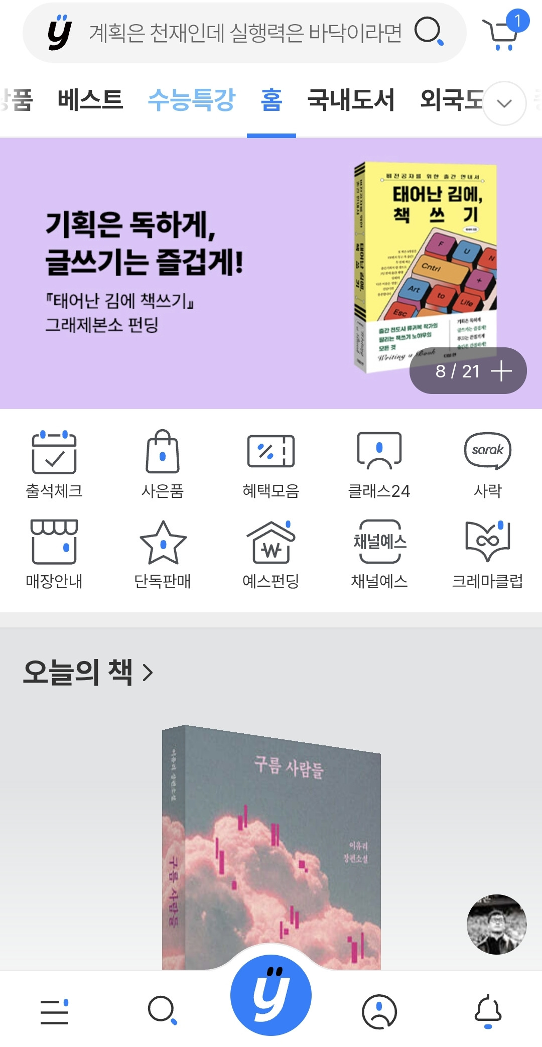 예스펀딩은 무명작가에게는 고민할 가치도 없는 완벽한 선택이다(나는 '선택'이라 쓰고 '선물'이라 읽는다). 예스펀딩에 선정되면 책이 YES24 홈페이지에서 노출되는 특전을 얻기 때문이다. 예스펀딩 페이지는 기본이고, 곳곳에 홍보 배너가 등장한다. 《태어난 김에, 책쓰기》는 기대 이상으로 많은 지원을 받았다. 푸시 알림으로 YES24 앱 사용자 전원에게 브런치 작가 류귀복의 신간 펀딩 소식이 전달되었고, 홈페이지 메인화면에서 책이 큼지막하게 노출되는 영광도 얻었다. 무명작가에게는 과분한 시작이 분명하다(귀한 소식을 제보해 주신 마음의 온도 작가님께 깊은 감사를 전한다).