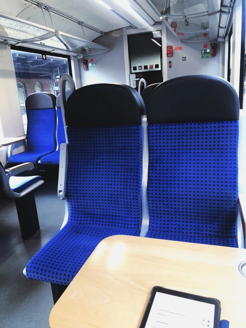 기차가 도착했다. 교통카드를 찍고 탔더니 기차에 사람이 많이 없어 널널하다. 앞뒤 마주 보고 앉는 의자 중 하나에 앉아서는 작은 테이블에 이북리더기를 놔두고 물을 한번 들이켠다.
