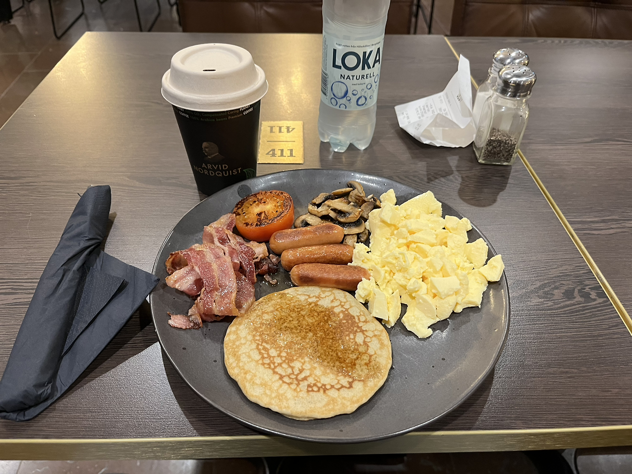 샌드위치나 냉장고의 음식은 먹기 싫고 이른 아침이지만 바에 가서 뭔가 주문할 수 있는 음식이 있냐 물었더니 'hot food'를 먹고 싶으냐 질문한다. 그래서 그렇다고 했더니 american breakfast를 추천해 준다. 그래서 좋다고 하고 다른 곳으로 가서 카페 라테와 물 하나를 구입했다.