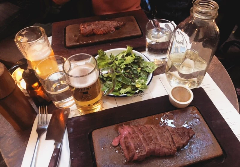 여행 메이트인 언니가 블로그를 통해 사전 조사를 엄청 해와서 그중에 한 곳인 Flat iron이라는 식당으로 가기로 했다. 들어서자마자 스테이크가 주력 메뉴인 이곳은 사람들로 북적북적한 분위기에 생동감이 넘쳤다. 다들 토요일밤에 그들의 친구, 연인, 가족과 수다를 떨며 저녁식사를 하느라 한껏 업된 분위기를 풍기고 있었다.