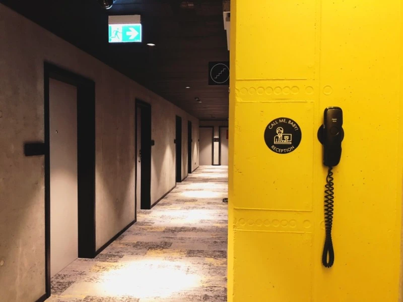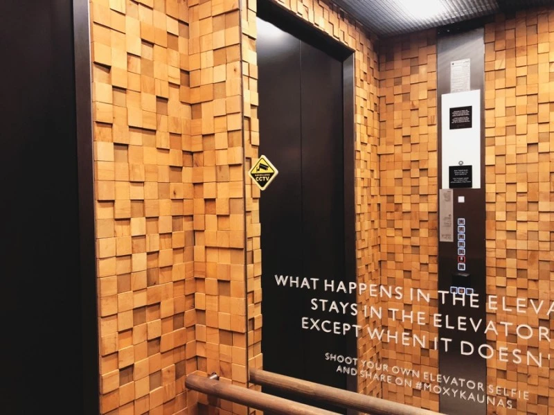 쨍한 색감이 좋았던, 그리고 되게 에코 프렌들리 느낌의 엘리베이터. 양문형이라 문이 양쪽 다 열림, 물론 한 층에선 한쪽만!