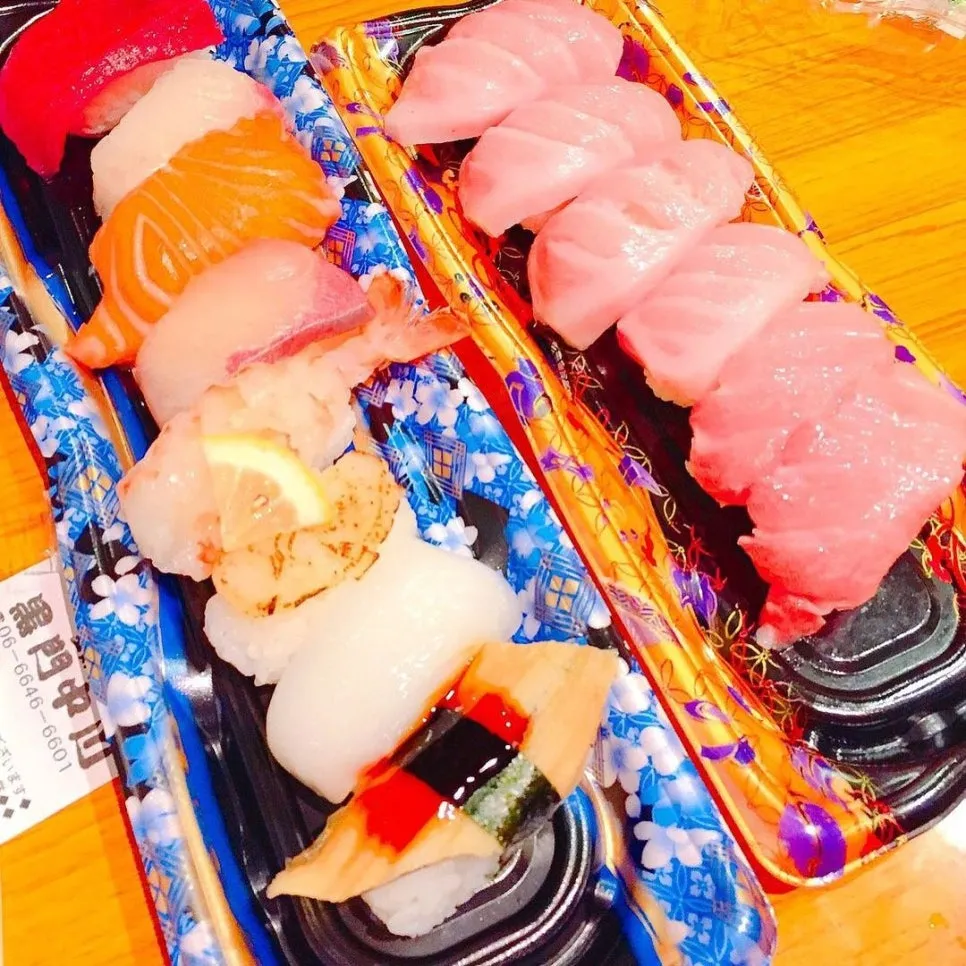 쿠로몬시장에 가서 신선한 초밥과 해산물 꼬치구이를 먹으며 에피타이저를 시작했다