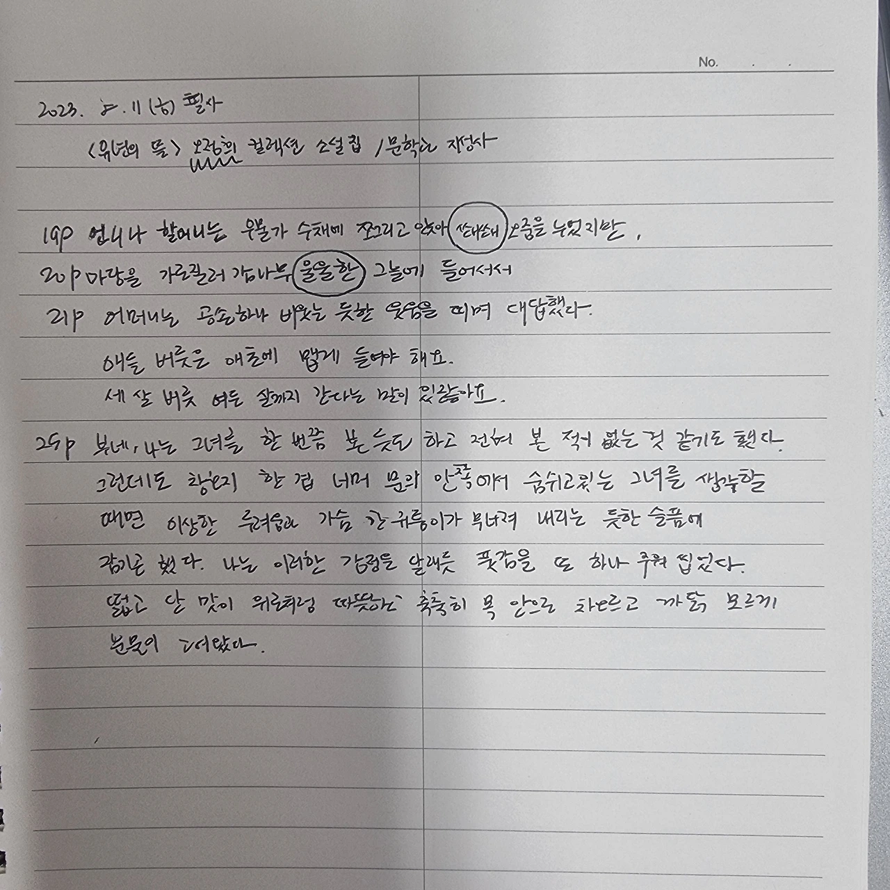 - 작품 중에 처음보는 부사나 형용사가 많아 배울것이 많다. 사전을 찾아가며 하나씩 배우고 있다. 다양한 표현을 할 수 있는 작가가 되고싶다는 도전의식이 생기는 작품이다.
