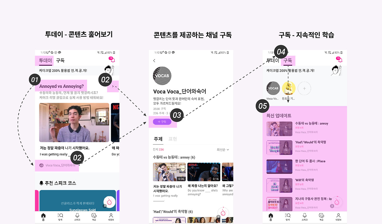 케이크의 큐레이팅 콘텐츠는 매력적인 헤드카피로 유저의 시선을 끈 다음, 배울 수 있는 표현들을 영상섬네일과 텍스트 조합의 형태로 5개를 제공합니다. 유저는 본문카피와 섬네일 그리고 영어 표현을(2,3,4번 정보) 읽어본 후 학습할지 말지를 결정합니다. 섬네일을 눌러 학습을 시작하거나, 콘텐츠를 조금 더 탐색하고 싶은 유저는 헤드카피 옆 화살표를 누르거나 콘텐츠를 제공하는 채널(5번)을 눌러 더 깊은 탐색경험을 시작합니다. 콘텐츠를 탐색하며 이 채널이 제공하는 콘텐츠가 마음에 들면 채널을 구독합니다. 그리고 구독한 채널은 [홈 - 구독 탭]에 담기게 되고, 유저는 구독한 채널에서 지속적으로 영어 표현을 학습하게 됩니다.