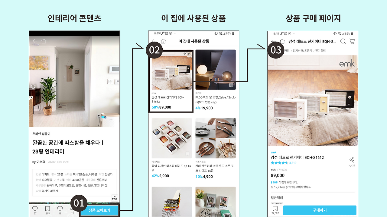 오늘의집의 인테리어 콘텐츠의 특징은 어떤 가구와 소품을 사용해서 꾸몄는지 설명해주는 정보와 함께, 이러한 인테리어를 왜 선택했는지, 어떤 라이프스타일을 영위하고 있는지까지 개개인의 스토리까지 담겨있습니다. 인테리어와 더불어 이야기가 있는 콘텐츠는 구매를 고민하는 유저의 마음을 사로잡습니다. 이때 구매자는 단순히 인테리어 용품을 산다기보다는 인테리어 소품을 구매함으로써 얻어지는 라이프스타일을 구매하고 싶기 때문이죠. 가구와 인테리어는 목적이 아니라, 나만의 홈 라이프를 영위하기 위한 수단이니까요. 오늘의집의 콘텐츠는 인테리어 용품을 사야 하는 이유를 만들어주고, 커뮤니티는 인테리어 콘텐츠가 지속적으로 생산되게 함으로써, 매일매일 새로운 라이프스타일 콘텐츠가 만들어지도록 유도합니다. 콘텐츠 안에서 마음에 드는 상품을 발견한 유저가 바로 구매할 수 있도록, 콘텐츠 내에 [상품 모아보기] 버튼을 항상 노출시킴으로써 유저의 구매를 유도하는 서비스 흐름을 설계했습니다.