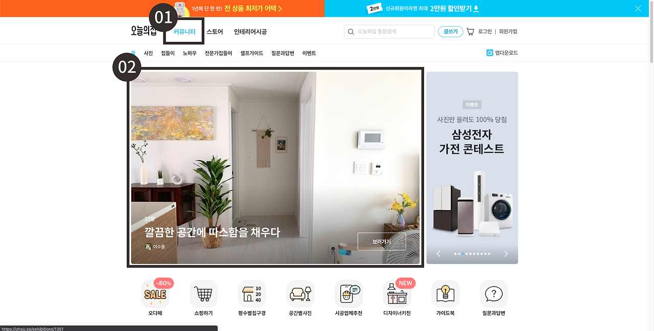 스토어 대신 커뮤니티와 인테리어 콘텐츠를 먼저 보여줍니다.