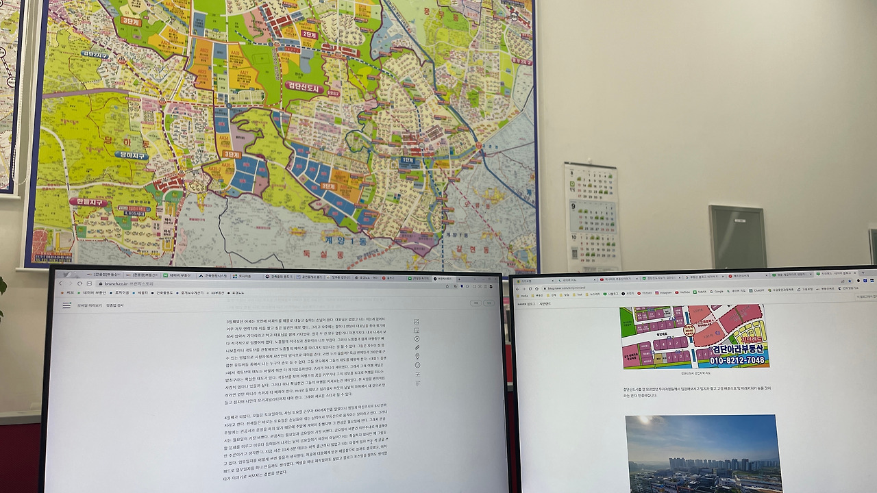 책상을 정리하면서 이곳에서 무엇을 해야 하는지 차근차근 익혔다. 고개만 들면 커다란 지도가 보이고 매장 앞을 나와 고개를 들고 보이는 건물의 정보는 파일에 저장되어 있어서 언제든지 정보를 볼 수 있게 되었다. 세움터라는 프로그램을 쓰면 건축물대장을 공짜로 볼 수 있는데 이를 통해 내가 찾는 건물의 사용승인일도 알 수 있고 건물 각 호의 소유자가 누군지도 알 수 있다. 그리고 부동산 써브라는 프로그램으로 네이버 광고를 할 수 있고, 유료 쿠폰을 써야 한다는 사실을 알게 되었다. 네이버 블로그, 티스토리, 브런치, 네이버스토어, 유튜브, 소모임까지 관리하기 때문에 이 정도의 프로그램을 다루는 건 너무 쉬운 일이다. 그러나 문제는 역시 트래픽이다. 사람을 끌어들이는 방법은 아직도 모르겠다. 그게 문제다. 예능 프로그램인 <장사 천재 백 선생>에서 백 선생의 행동 하나하나를 유심히 보고 있다. 그리고 나와 비교해 보면 얼마나 다른지 뼈저리게 느껴진다. 그저 고마울 따름이고 얼른 정주행 해야겠다는 마음뿐이다.