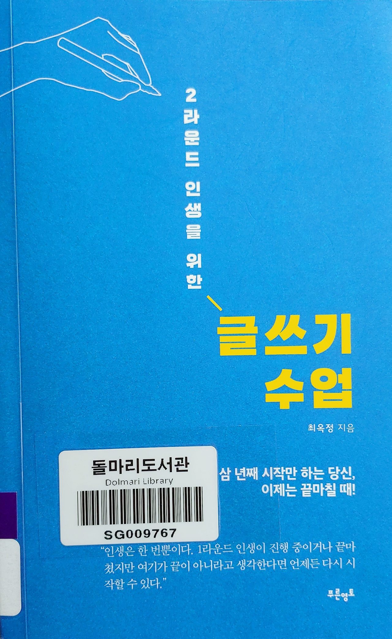 이 책은 나에게 글쓰기를 가르치는 것이 아닌, 다시 사는 인생의 가르침을 주었다. 여러 글쓰기 책을 읽었지만, 이 만큼 울림을 준 책은 없었다. 저자가 세상을 빨리 떠나는 것이 안타까울 뿐이다. 조금 더 최옥정 작가의 글과 말을 배울 수 있었을 텐데.