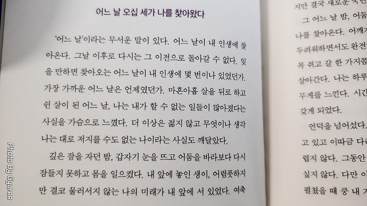 그 어느 날 밤, 어둠 속에서 보았던 내 미래의 모습은 가끔 나를 찾아온다. 어깨가 구부정하고 조금은 겸손해진 채 삶을 두려워하면서도 완전히 투항하지는 않았다. 죽을 때까지 손에 꼭 쥐고 갈 한 가지쯤은 가지고 있는 나를 데리고 하루하루를 살아간다. 나는 하루가 중요하다는 것을 알아버렸다. 하루의 무게를 느낀다. 시간과 공간의 결을 섬세하게 느끼는 감성도 갖게 되었다.