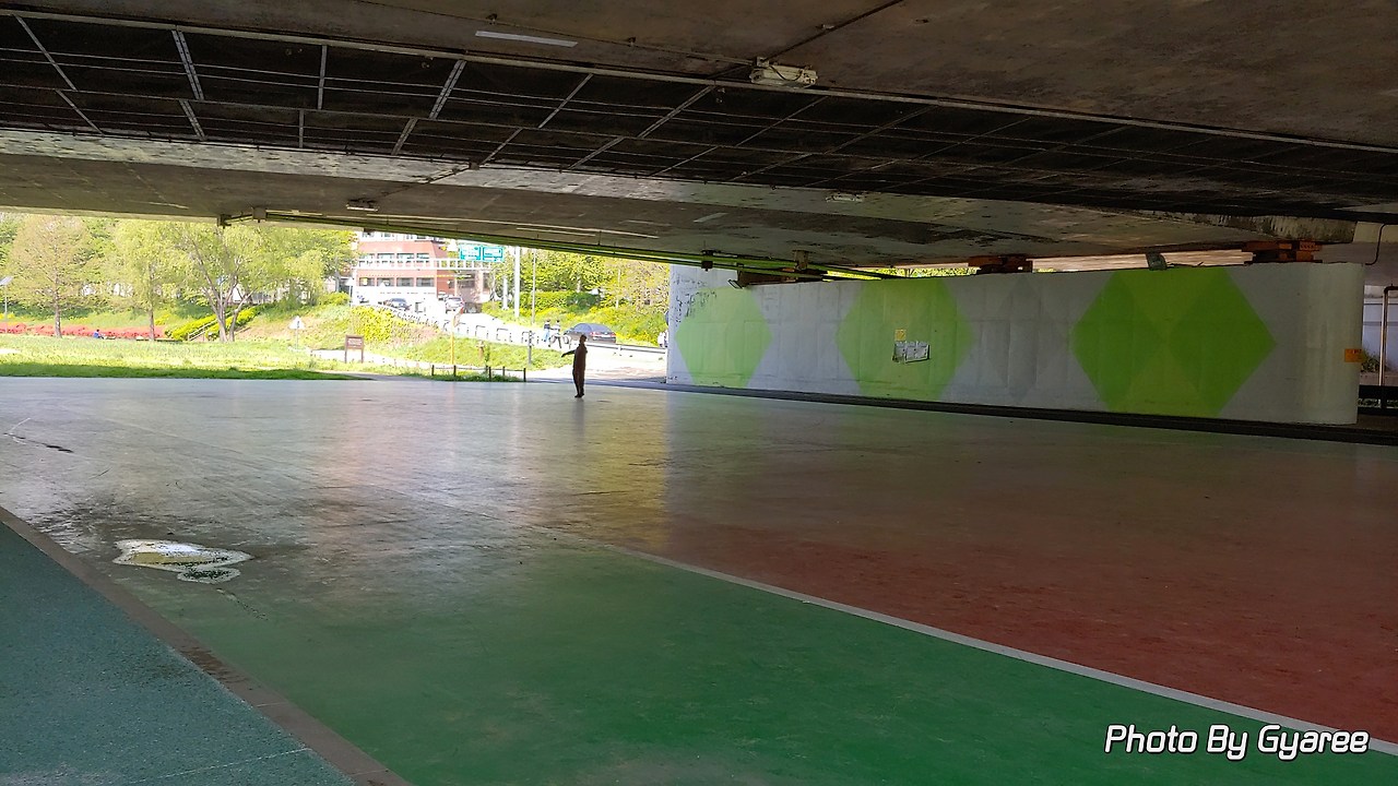 인라인스케이트, 롤러스케이트, 테니스, 댄스, 색소폰 연주, 자전거, 전동 바이크, 킥보드, 배드민턴, 롱보드, 애완견, 캐치볼, 축구. 양재천에서 이 모든 놀이를 할 수 있는 장소는 딱 한 군데다. 아침 출근길 걸으며 세 번째 만나는 다리가 영동 1교다. 요즘은 이 주변 양재천 우안 도로 공사로 어수선해 걷기에 부담스러운 면도 있다. 산책로까지 침범한 대형 트럭과 교각 공사의 여파는 먼지구름을 흩날려 입과 코를 막고 걸어가게 한다. 그렇게 영동 1교 밑에 다다르면 넓은 광장이 나타난다. 안쪽 바닥은 붉은색으로 칠하고 둘레는 녹색으로 칠한 꽤 넓은 공간이 사람들을 맞이한다. 다리 밑이라 햇볕이 들지 않아 어둑하지만, 한여름 이곳은 더위를 피하는 곳으로 제격이다. 땡볕에 땀 흘리며 걷는 사람에게 휴식의 공간이 되어주기도 하고 아이에게는 킥보드를 타고 씽씽 소리를 내며 안전하게 달릴 수 있는 운동장으로서도 훌륭하다. 어디 그뿐일까. 아침에 이곳을 지나가다 우연히 멋진 색소폰 연주 소리에 놀라기도 한다. 다리 뒤에 숨어 수줍게 색소폰을 부는 아저씨. 그 색소폰에서 퍼진 소리는 다리와 바닥이 울림판이 되어 콘서트홀 같은 착각을 불러일으키기도 한다. 영화 '셸 위 댄스'를 떠올리게 하는 어느 중년 아저씨의 나 홀로 댄스 삼매경. 같은 시간에 색소폰 아저씨와 이 공간에 있었더라면 한 편의 훌륭한 영화가 되지 않았을까. 정말 '셸 위 댄스'처럼. 재미있는 상상을 해본다.