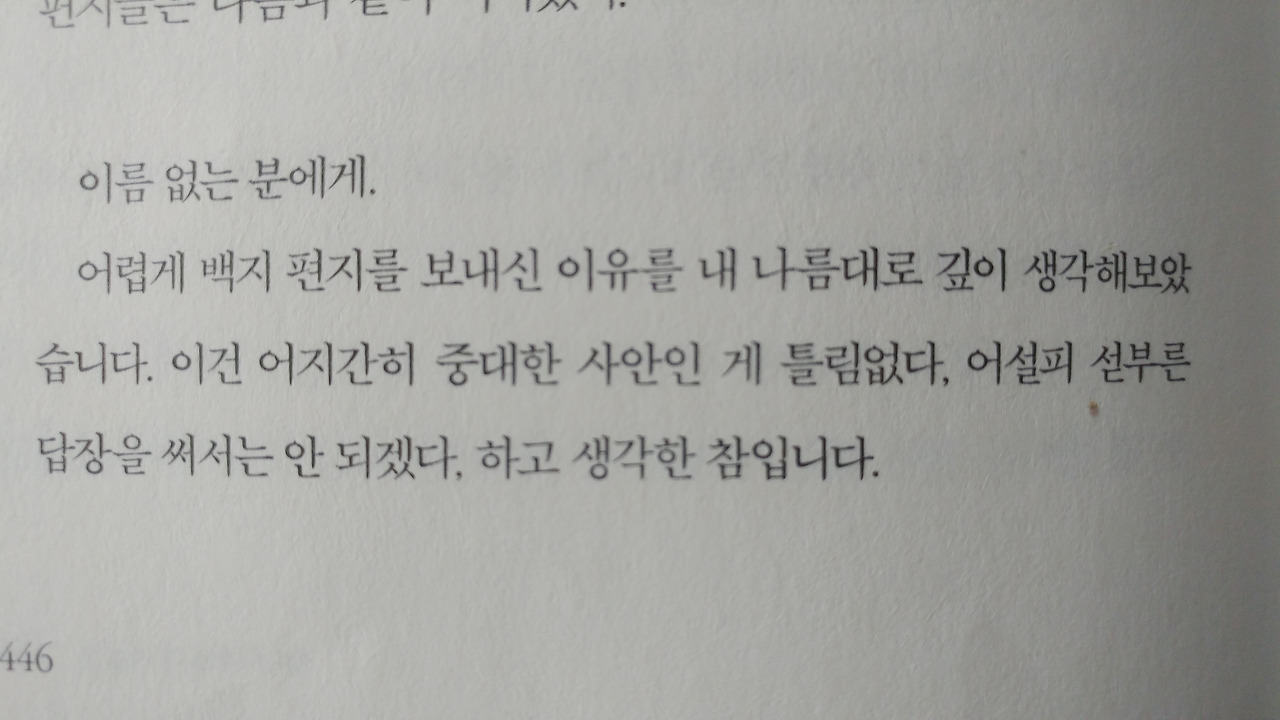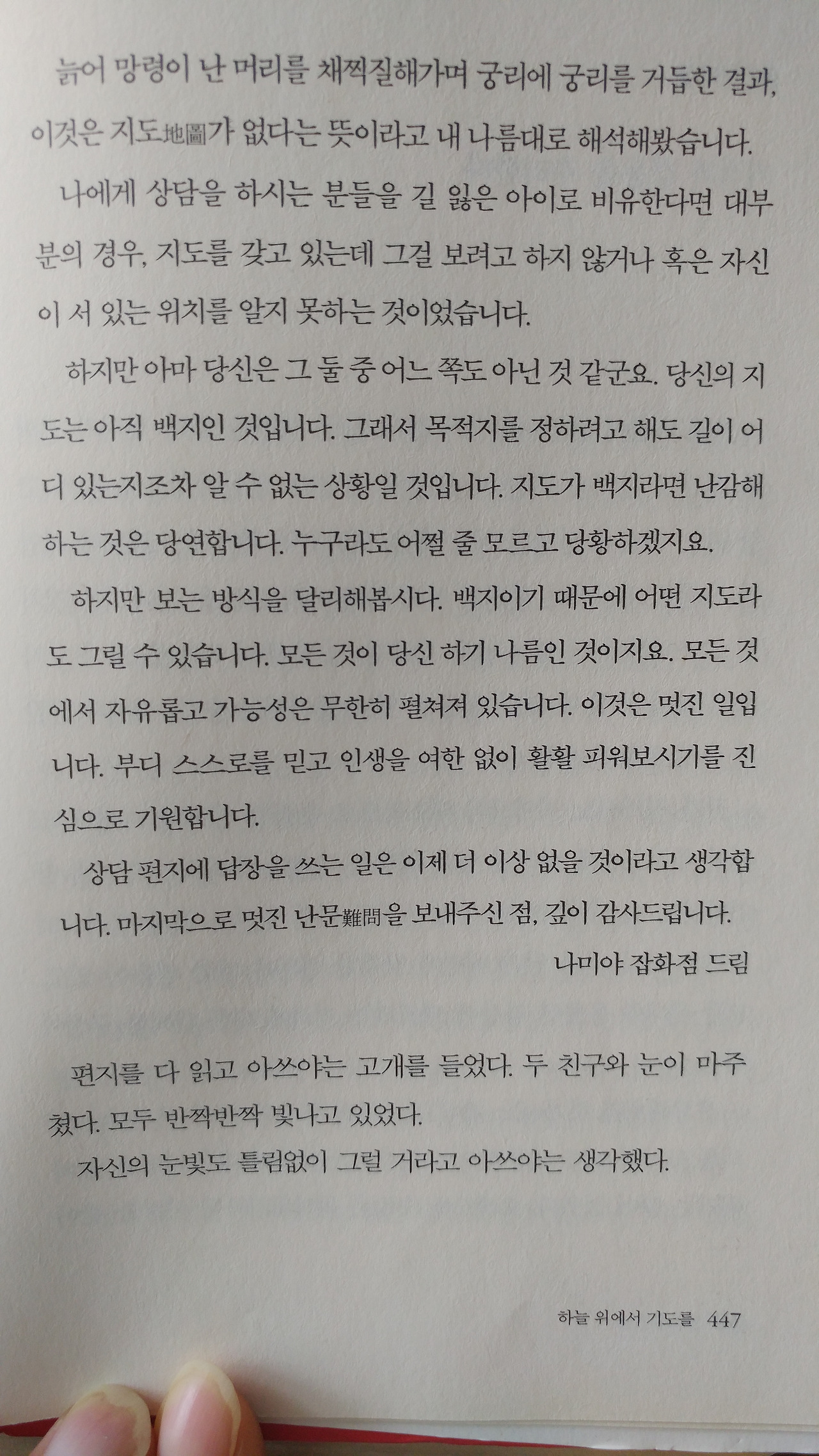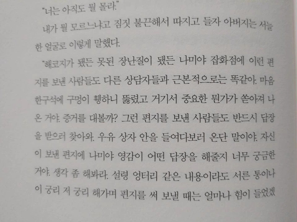 "해코지가 됐든 못된 장난질이 됐든 나미야 잡화점에 이런 편지를 보낸 사람들도 다른 상담자들과 근본적으로는 똑같아. 마음 한구석에 구멍이 휑하니 뚫렸고 거기서 중요한 뭔가가 쏟아져 나온 거야. 증거를 대볼까? 그런 편지를 보낸 사람들도 반드시 답장을 받으러 찾아와. 유유 상자 안을 들여다보러 온단 말이야. 자신이 보낸 편지에 나미야 영감이 어떤 답장을 해줄지 너무 궁금한 거야. 생각 좀 해봐라. 설령 엉터리 같은 내용이라도 서른 통이나 이 궁리 저 궁리 해가며 편지를 써 보낼 때는 얼마나 힘이 들었겠냐. 그런 수고를 하고서도 답장을 원하지 않는 사람은 절대로 없어. 그래서 내가 답장을 써주려는 거야. 물론 착실히 답을 내려줘야지. 인간의 마음속에서 흘러나온 소리는 어떤 것이든 절대로 무시해서는 안 돼."