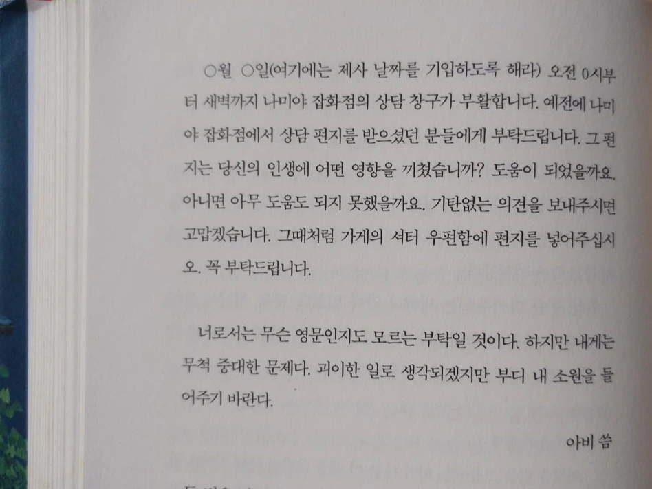 ⃝월 ⃝일(여기에는 제사 날짜를 기입하도록 해라) 오전 0시부터 새벽까지 나미야 잡화점의 상담 창구가 부활합니다. 예전에 나미야 잡화점에서 상담 편지를 받으셨던 분들에게 부탁드립니다. 그 편지는 당신의 인생에서 어떤 영향을 끼쳤습니까? 도움이 되었을까요. 아니면 아무 도움도 되지 못했을까요. 기탄없는 의견을 보내주시면 고맙겠습니다. 그때처럼 가게의 셔터 우편함에 편지를 넣어주십시오. 꼭 부탁드립니다.