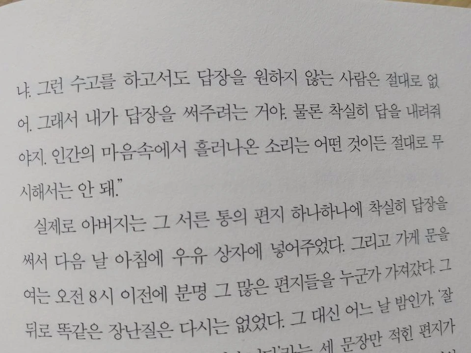 실제로 아버지는 그 서른 통의 편지 하나하나에 착실히 답장을 써서 다음 날 아침에 우유 상자에 넣어주었다. 그리고 가게 문을 여는 오전 8시 이전에 분명 그 많은 편지들을 누군가 가져갔다. 그뒤로 똑같은 장난질은 다시는 없었다.