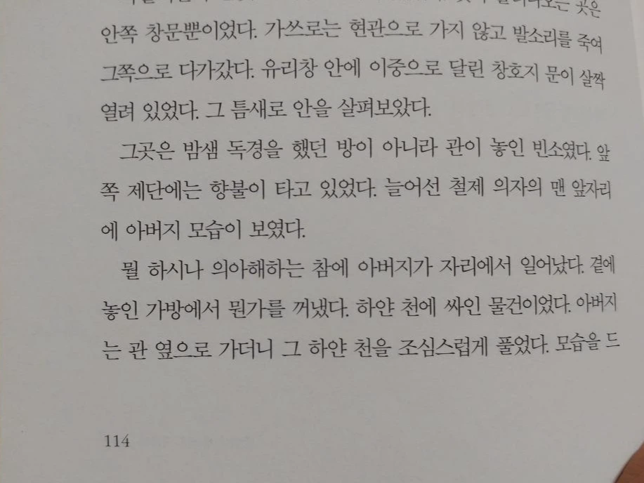 그곳은 밤샘 독경을 했던 방이 아니라 관이 놓인 빈소였다. 앞쪽 제단에는 향불이 타고 있었다. 늘어선 철제 의자의 맨 앞자리에 아버지 모습이 보였다.