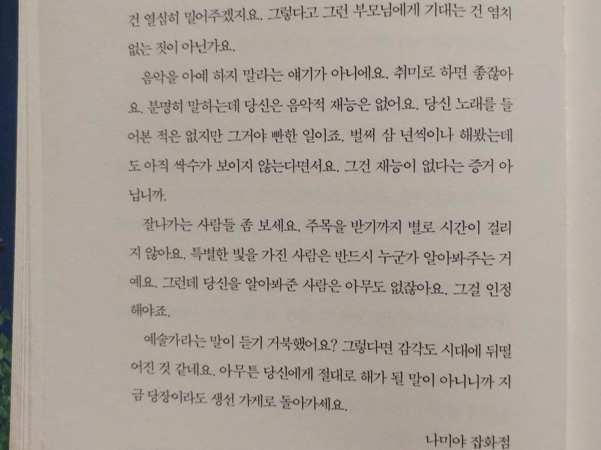 어린 시절 우연히 꽂힌 일에 누구보다 열심히 매진했다. 부모 형제의 눈에서 눈물을 빼가면서 온갖 어려움을 무릅쓰고 오로지 그 길을 향해 달렸다. 하지만 무심한 세월만 흘러갈 뿐 손에 잡히는 성과는 없고 초조한 마음만 쌓여간다. 나는 과연 재능이 있는 것일까. 스스로의 재능에 대해 모락모락 피어오르는 의심은 인간에게서 모든 의욕을 빼앗아간다. 그런 때에 '당신의 노력은 절대로 쓸데없는 일이 되지는 않습니다. 마지막까지 꼭 믿어주세요. 마지막의 마지막 순간까지 믿어야 합니다'라는 답장이 날아온다. 주위의 능력자들은 휙휙 앞서가는데 나 혼자만 한참 뒤처진 채 아둔한 노력으로 때우고 있는 것 같아 문득 덧없고 슬퍼질 때는 이 말을 주문처럼 외워볼 생각이다. '생선 가게 뮤지션님, 당신의 노력은 절대로 쓸데없는 일이 되지는 않습니다!'