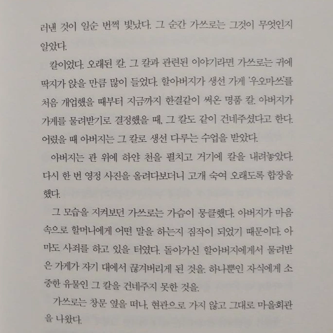 그 모습을 지켜보던 가쓰로는 가슴이 뭉클했다. 아버지가 마음 속으로 할머니에게 어떤 말을 하는지 짐작이 되었기 때문이다. 아마도 사죄를 하고 있을 터였다. 돌아가신 할아버지에게서 물려받은 가게가 자기 대에서 끊겨버리게 된 것을. 하나뿐인 자식에게 소중한 유물인 그 칼을 건네주지 못한 것을.