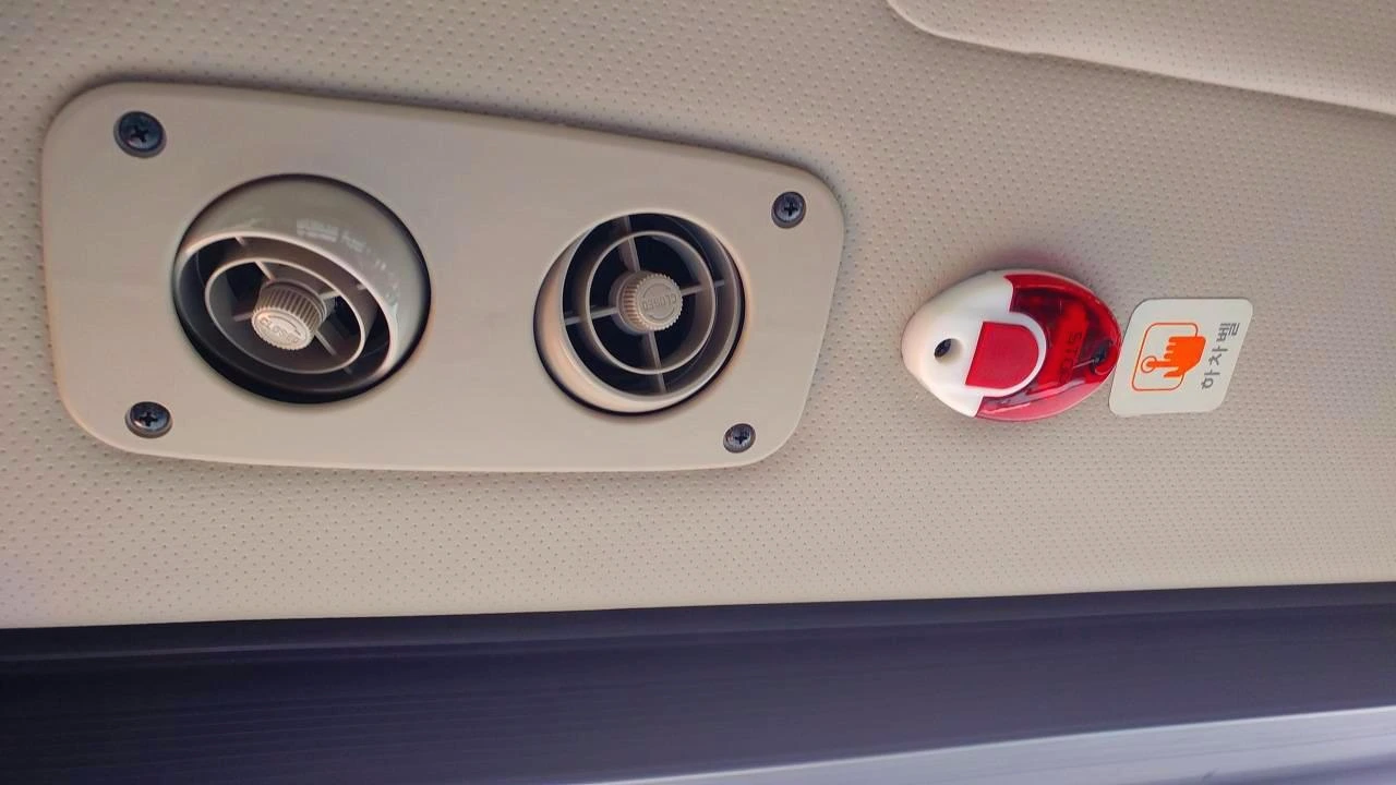 에어컨 바람이 너무 세서 구멍을 틀어막으려 왼쪽 위로 올려다봤다. 에어컨 통풍구 바로 옆에 하차 벨이 '떡'하니 자리 잡고 있다.