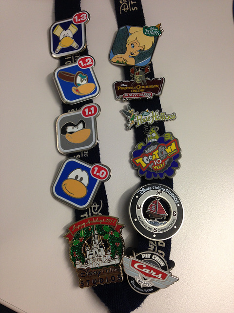 2013년 6월은 제가 디즈니 입사한 지 6년이 되는 달이기도 했지만 툰타운 온라인이 서비스를 시작한 지 10년이 되는 달이기도 했어요. 그런데, 당시는 클럽 펭귄에 All In 하고 있었잖아요? 그래서 정말 소박하게 10주년을 기념했습니다. 아래 사진은 그동안 기념으로 만들었던 핀들을 모아서 찍은 사진인데요, 툰타운 10주년을 기념해서 만든 기념핀도 그중에 있습니다. 보이시나요?