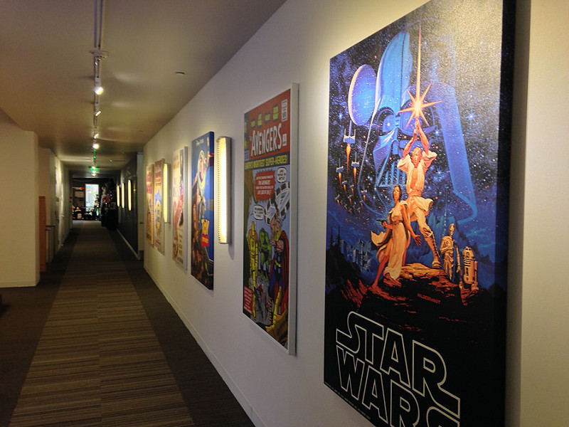 특히, Pixar 애니메이션 Cars IP를 이용한 다이캐스트 자동차 완구 판매량이 어마어마하다고 들었어요. 위의 사진은 이 자동차 완구를 DCP 복도에 전시해 놓은 걸 찍은 거예요. 아래 사진처럼, 디즈니가 소유하고 있는 영화 포스터 들도 한쪽 벽에 전시되어 있었습니다.