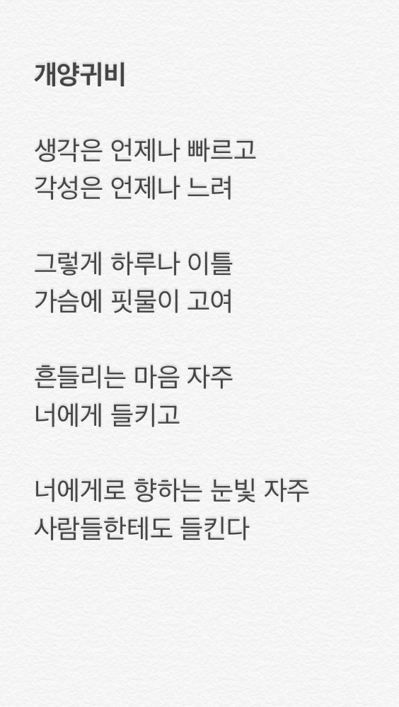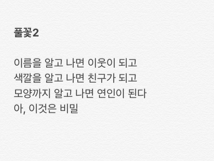 어린 시절 이후로 더 이상 시를 쓰지 못했던 이유를 <꽃을 보듯 너를 본다>를 읽으며 희미하게나마 깨닫게 됐다. 어릴 적엔 하나를 보면 마침표로 끝맺지 않고 물음표를 달고 새로운 것을 찾아 움직였다. 무엇을 보든 궁금증이 생겨 깊게 보고 한참 보고 돌려 보고 마치 꽃을 보듯 자세히 보았던 것이다.