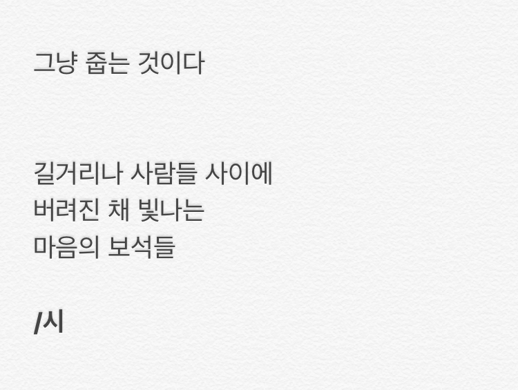 그런 내게 다시 '시'를 가져다준 것은 노작가의 아기자기한 글말들이었다. 그는 시를 통해 많은 것을 담으려 하지 않는다. 거창함 따위는 없다. 따뜻한 시선으로 세상을 살펴보며 그 순간 느끼는 바를 적을 뿐인데, 아 그것들이 너무나 절묘하다. 내가 절묘함을 느꼈다는 것은 나 역시 그처럼 생각하고 느낀다는 증거이기도 했다. 자신감이 생겼다. 내 주위를 돌아보기 시작했다. 마치 꽃을 보듯, 아름다운 것을 보듯. 아름답지 않아도 사랑스러운 그/녀를 보는 마음으로 호흡을 고르고 편견 없는 눈으로 내 세상을 바라보았다. 조금씩 보이지 않던 것들이 보이고, 보고 싶지 않던 것들도 달리 보인다. 그제야 길게 늘어놓았던 내 글에서 사라져도 될 군더더기들이 보였다.