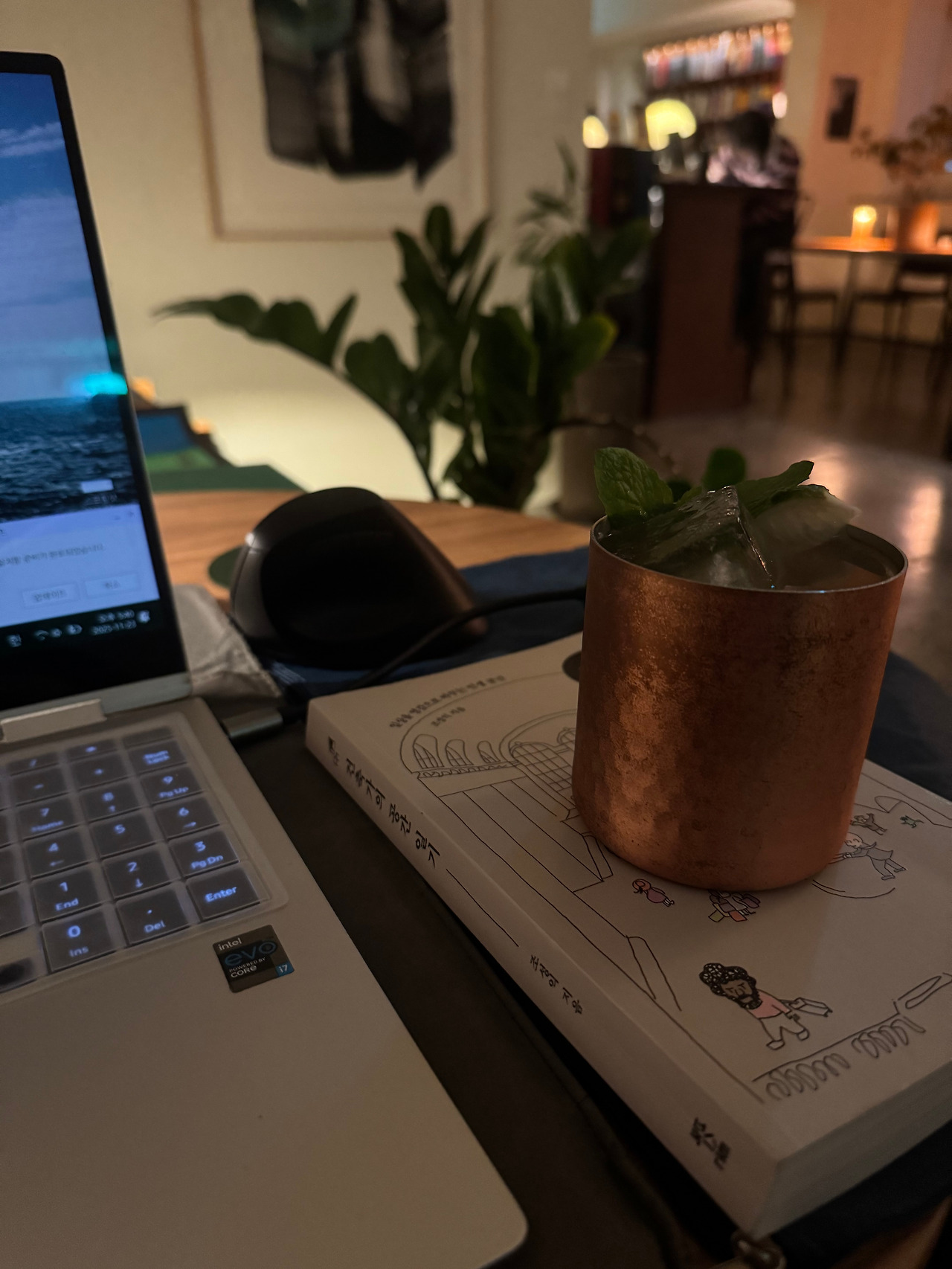 결과부터 말하자면, 나는 이 공간을 너무 좋아하게 되어 버렸다. 진갈색 우드톤의 인테리어, 가사가 없는 재즈음악, 그리고 이곳을 찾아오는 사람들의 분위기, 이것들이 합쳐져서 집중할 수 있는 환경을 만든다. 다만, 여기에서 집중이란 독서실에서 수험생들이 자아내는 그런 침묵과는 완전 딴판이다. 고요한 가운데, 여유가 흐른다. 독서하는데 '칵테일이나 위스키 한 잔 정도는 걸쳐도 별 문제없다'는 시크한 태도의 사람들이 모여서였을까? 재촉하지 않고, 매너 있게 접객하는 직원들 때문이려나? 오래간만에 마치 잠수하듯 집중할 수 있는 공간을 찾은 것 같아서 신나고 설렜다. 아마 책을 읽을 때가 아니라 주말에 일을 할 때도 이곳에 종종 들르게 될 것만 같다.