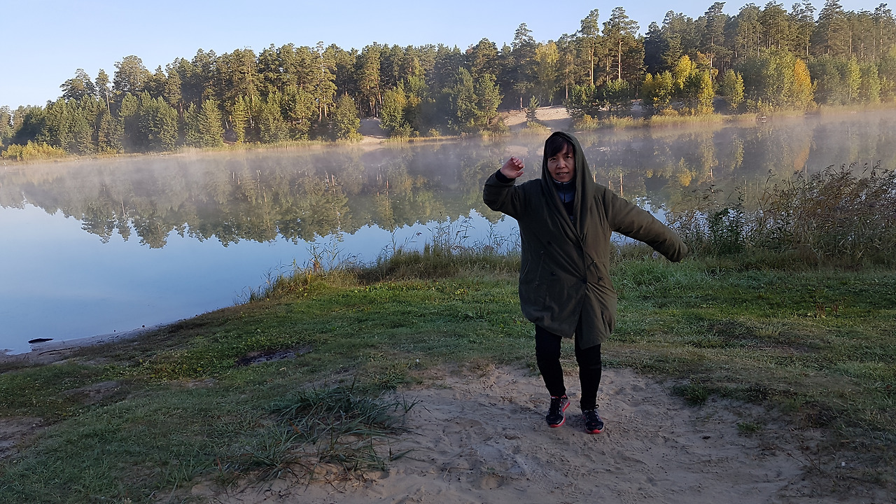 해가 조금씩 떠오르며 물안개가 피어오르기 시작하고 호수에 빛보석이 깔리기 시작할 무렵 밖으로 나갔다. 수면 내복에 웃옷만 걸찬 차림으로. 주머니에 요가 음악을 틀어놓고 요가를 시작했다. 나중엔 손도 땅에 직접 대고 했는데 손에 흙이 전혀 묻지 않았다. 양말까지 벗으니 더욱 마음이 자유로워진다. 바닷가처럼 고운 모래사장이 드넓게 펼쳐져있다. 드넓은 무대에서 덩실덩실 춤을 추었다. 그리고 호숫가로 가서 파란 하늘이 가득 담긴 물로 세수를 했다.