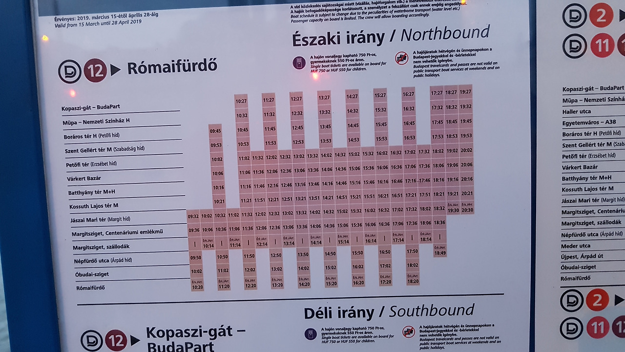 미술관에서 나와 광민은 바로 옆 궁전에 가자고 했다. 전시관을 두 곳 방문하느라 난 조금 지쳤고 하루라도 멋진 날씨의 부다페스트를 보고 싶다는 욕망을 포기하지 못한지라 내일 가면 안돼냐고 다시 한 번 틈새 공략. 그리고 이쯤 해서 24시간 이내 달성해야 할 '배 타기'를 시도해 봐야 할 것 같았다. 퍼블릭 페리 보트( 교통수단으로 쓰이는 배라 가격이 저럼하고 부다페스트 카드 안에 사용료가 포함되어있다.)가 주말에는 제외라는 어느 블로거의 말이 있어 물어보았지만 현지 여행안내하는 사람들도 잘 모른다. 하지만 사이트에서 오늘 날짜와 시간이 뜨는 것을 봐서는 가능성이 있다. 보트를 타고 야경을 보는 편이 멋있을 것 같은데 내일은 오전까지 밖에 시간이 남지 않기 때문에 어차피 매력이 떨어지니 무조건 시도해 봐야 한다.