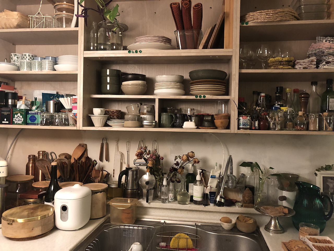 집에 들어선 첫 느낌은 잘 꾸며진 선물가게나 카페 같다. 분명 엉성하게 보이는 옛날 집인 데다 여기저기서 가져온 쓰던 가구들이며 물건들, 분명 개별적으로는 내 취향에 맞지 않은 것들까지 잘 어울리다 못해 서로를 빛내준다. 그리고 나를 푸근하면서도 설레게 만든다.