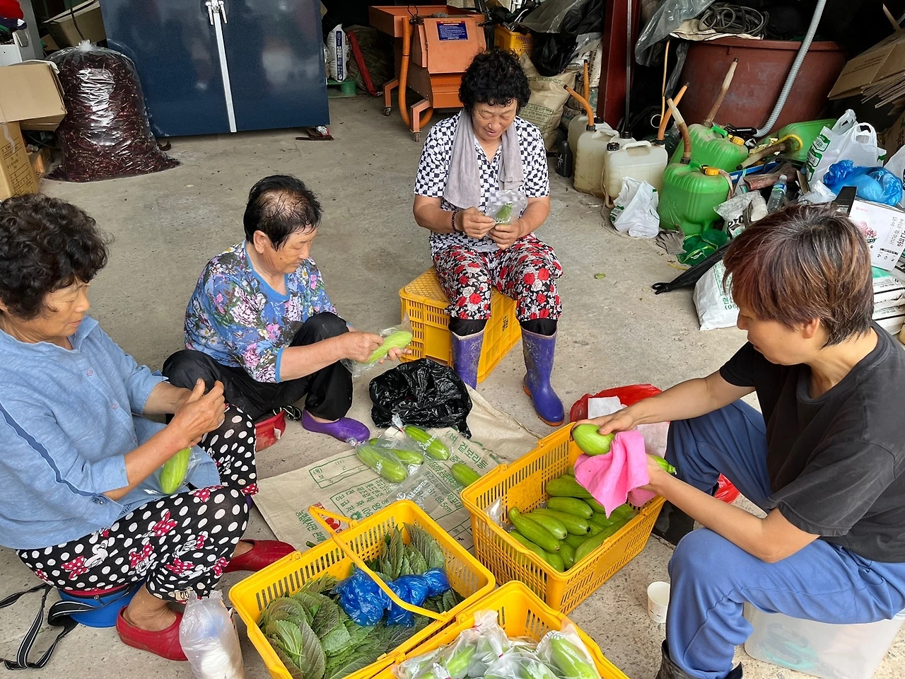아직은 따로 작업장이 없어서 부녀 회장님네 창고에서 포장 작업을 한다. 아침부터 옹기종기 모여 앉아 푸짐한 수확물들을 만지작 거리는 것은 너무 재밌고 기분 좋은 일이다.
