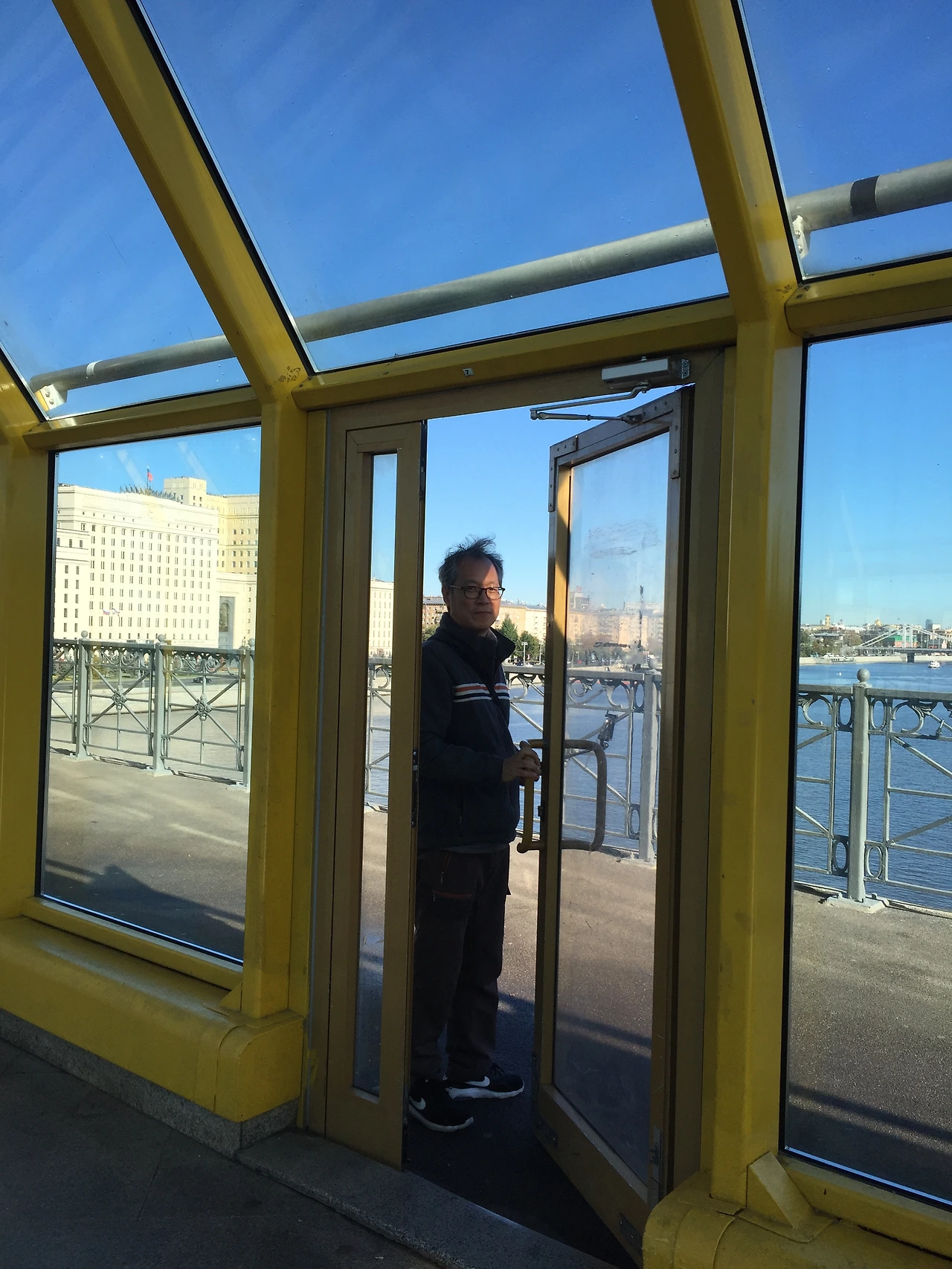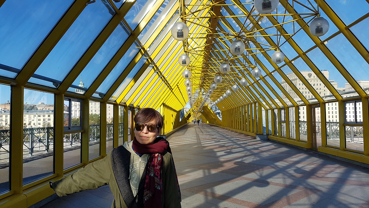 생각보다 넓은 공원 뒤편엔 커다란 강이 흐르고 건너편으로 다리가 연결되어 있다. 다리는 넓은 실내공간과 외부로 나뉘어 있었다. 천정과 벽이 온통 유리로 덮여 실내지만 답답하지 않다. 추운 러시아의 겨울에 따뜻하게 경치를 즐기며 이 다리를 건널 수 있겠구나...