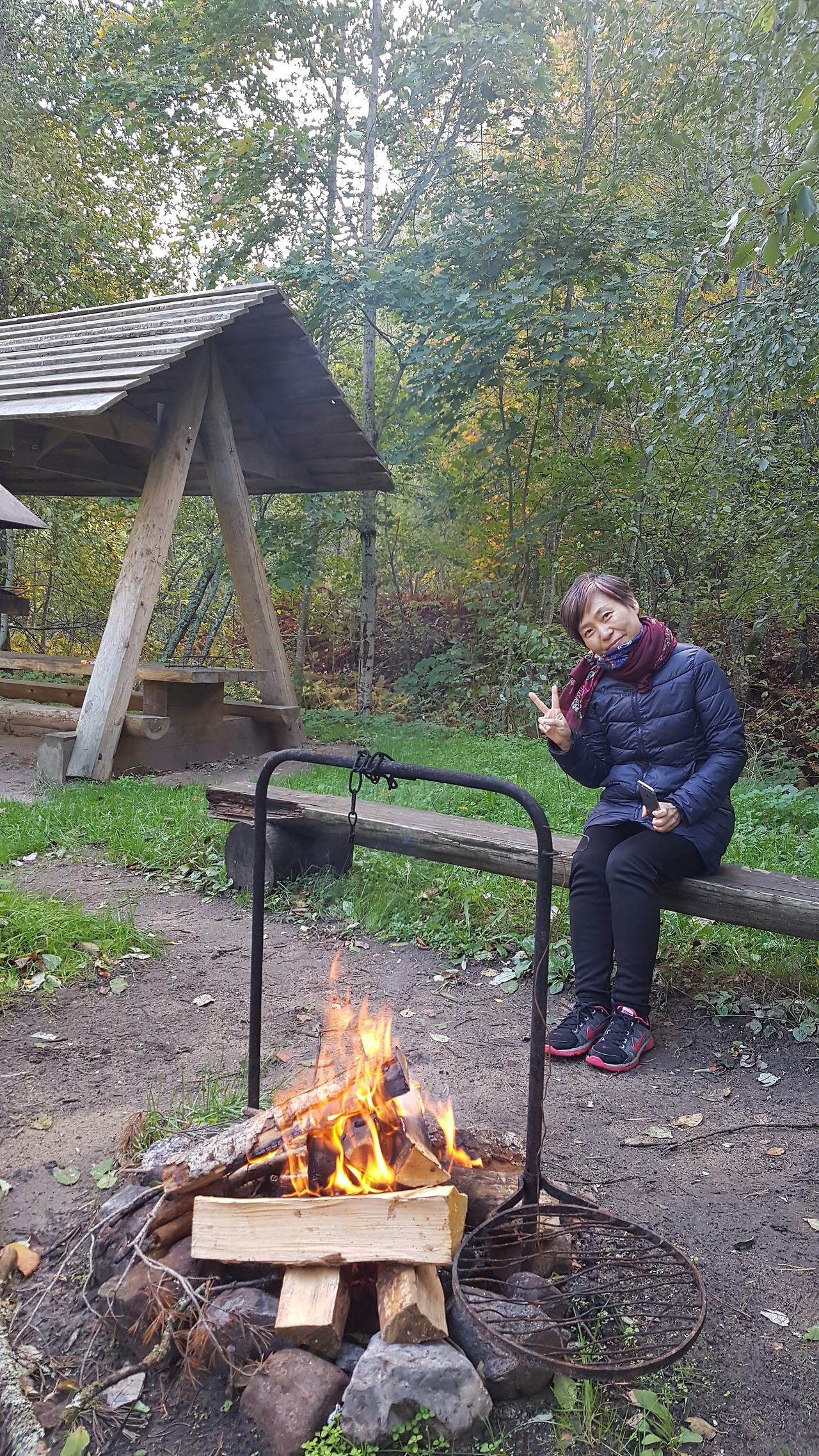 우리나라는 산에서 절대 불을 피울 수 없는데 이 곳엔 불을 피울 수 있는 시설들이 완벽하게 갖춰져 있다는 게 신기하다. 시간이 지나면 호박으로 변해버리는 마차처럼 지금 누군가가 우리를 위해 마법을 부려놓은 것 같다. 이 꿈속 같은 시간에도 바람님은 할 일을 잊지 않고 러시아에서부터 틈틈이 해오던 단열공사를 마무리했다. 그래서 낯 선 숲에서 더 따뜻하고 아늑한 밤을 맞이할 수 있었다.