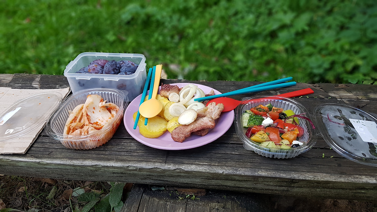 숲 속엔 우리를 위한 보물들이 많이 있다. 먹을 수 있는 수도가 있고, 러시아와는 비교도 되지 않는 깨끗한 화장실에 바비큐 시설까지.. 우리는 찬찬히 둘러보고 물도 얻고 화장실을 비운 뒤 불장난을 시작했다. 바람님이 근처에서 도구를 찾아내 장작을 쪼갠다. 별로 해본 적도 없을 텐데 잘한다. 불도 잘 피운다. 차가운 숲 속이 장작불로 따뜻해지고 마음이 여유로워지자 바람님이 고기를 굽겠다고 한다.