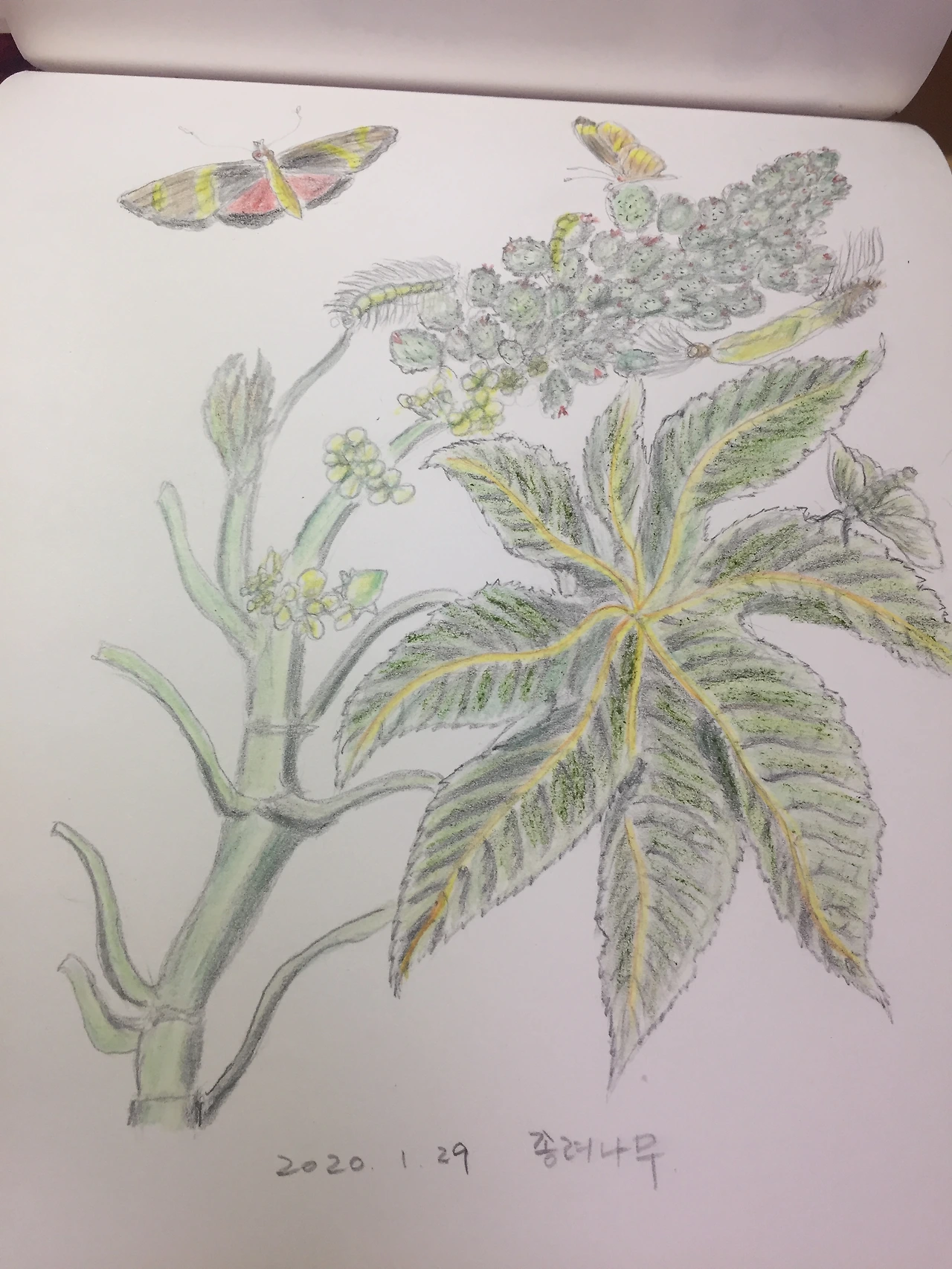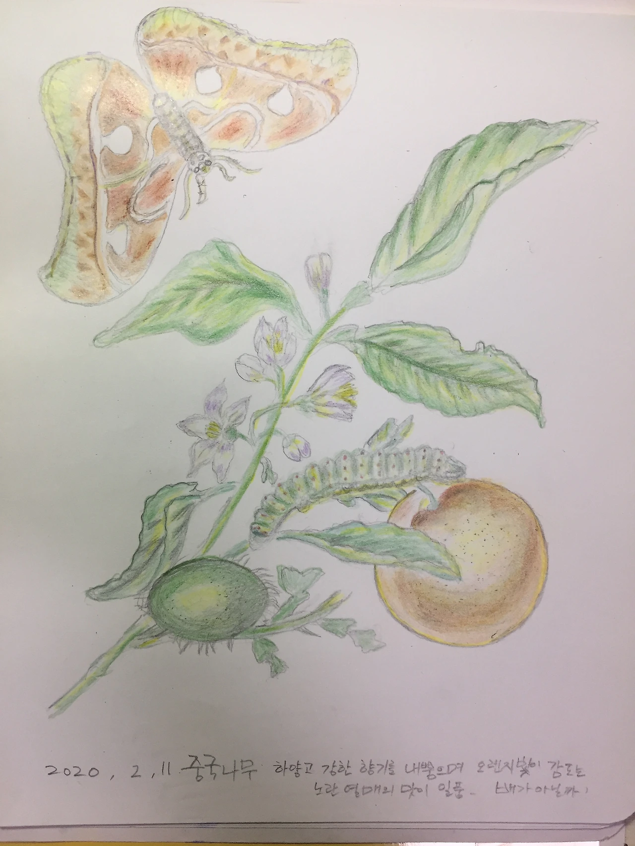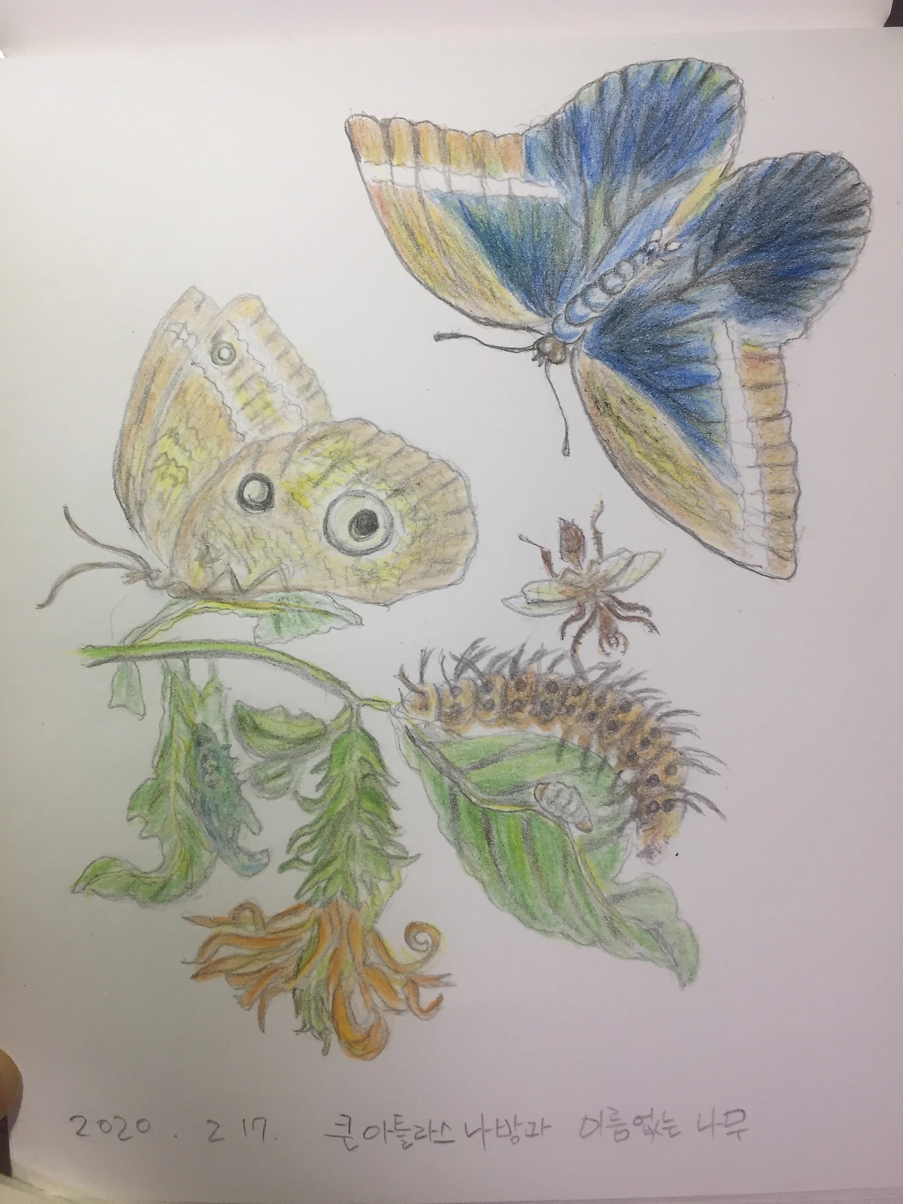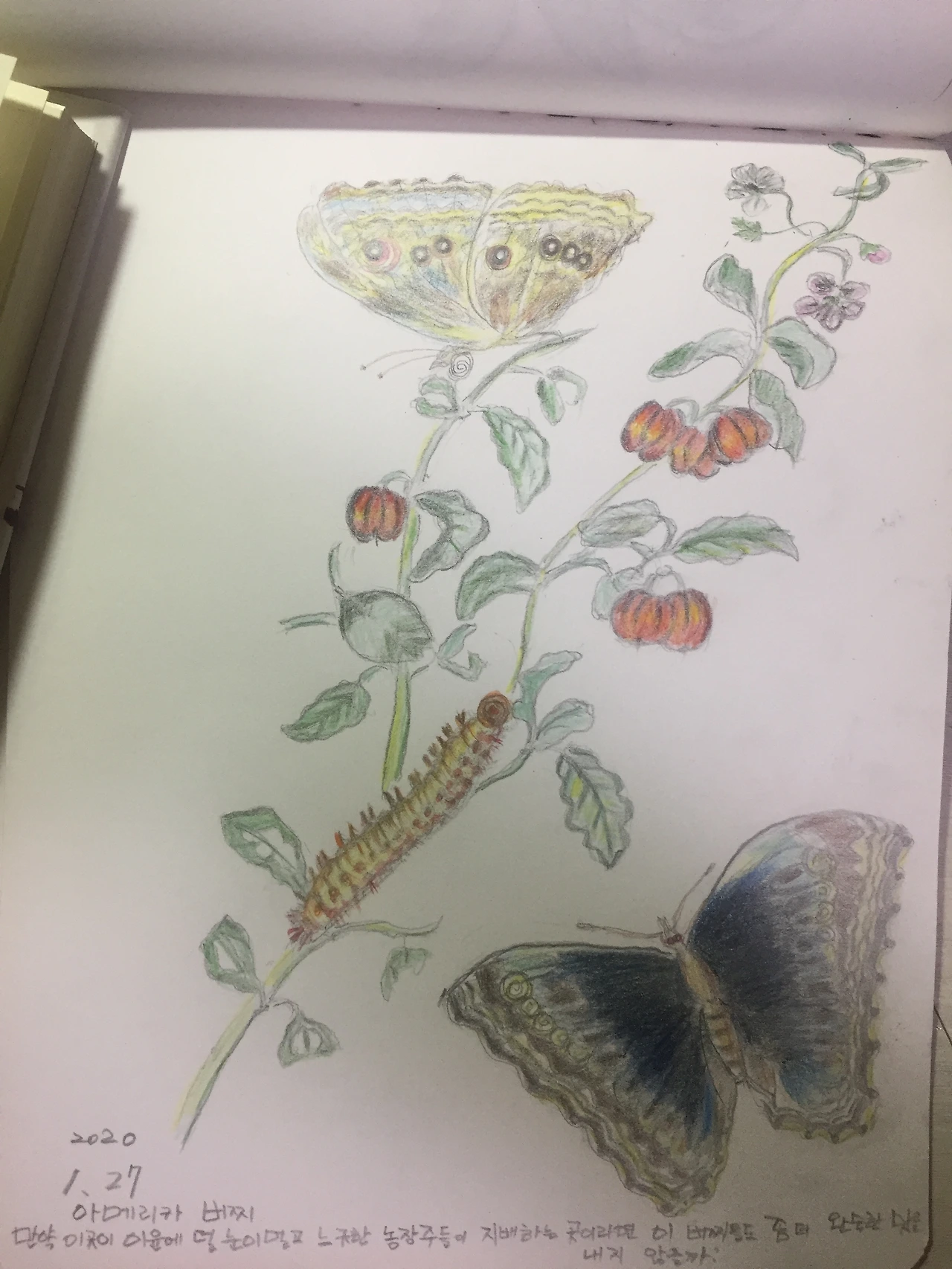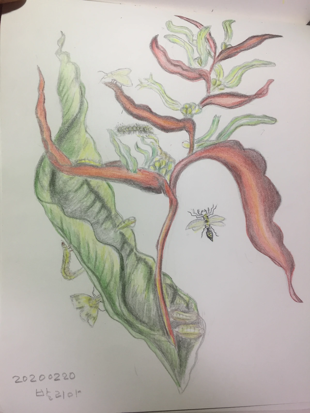 그림에 대한 이야기를 쓰려다가 그만두기로 했다. 다들 나처럼 메리안과 직접 만나보는 게 더 좋을 것 같기 때문이다. 되도록 메리안의 그림을 그대로 따라 그렸지만 내 그림 수준이 높지 않고 색연필 색깔이 많지 않아서 다르게 표현된 부분도 많다.특히 파인애플의 경우는 내가 기억하는 것과 너무 달라서 거의 창작 수준으로 그렸다.나로선 나다운 그림이 되어 만족스럽다. 오히려 이런 점이 이 글을 읽는 분들이 메리안의 그림을 직접 보는 계기가 되면 더 좋겠다.더불어 메리안같은 좋은 친구를 소개해 주신 김선지 작가님의 글도 적극 추천한다.
