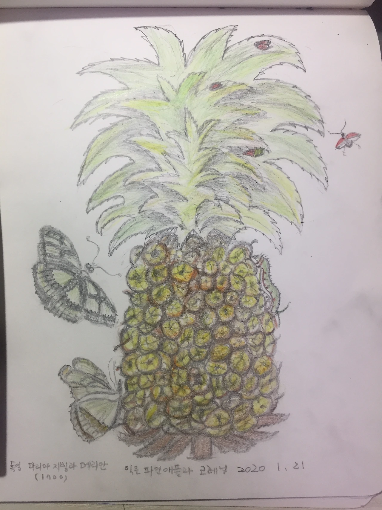 그림에 대한 이야기를 쓰려다가 제목만 달기로 했다. 가능하면 다들 나처럼 메리안과 직접 만나보는 게 더 좋을 것 같기 때문이다. 가능하면 메리안의 그림을 그대로 따라 그렸지만 내 그림 수준이 높지 않고 색연필 색깔이 많지 않아서, 다르게 표현된 부분도 많다. 특히 맨처음 그린 파인애플의 경우는 내가 기억하는 것과 너무 달라서 거의 창작 수준으로 그렸다. 나로선 나다운 그림이 되어 만족스럽다. 오히려 이런 점이 이 글을 읽는 분들이 메리안의 그림을 직접 보는 계기가 되면 더 좋겠다.