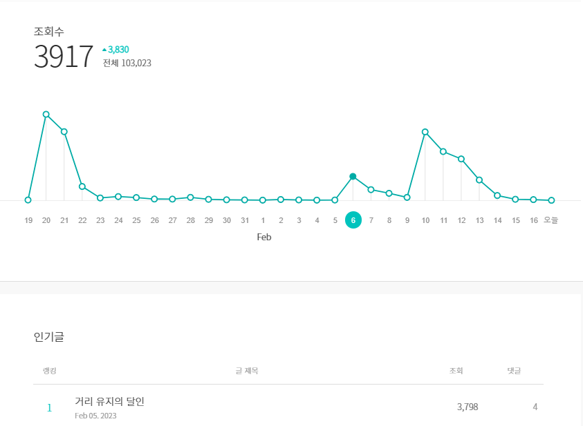 나의 글은 총 4번 노출되었고 2번은 같은 위치 & 같은 탭이었고 조회수가 비슷했다.