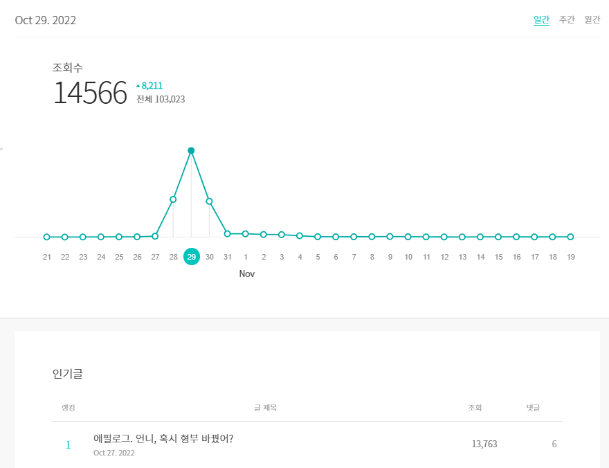 브런치 유입이 많아지면 라이킷과 구독자수 변동이 생긴다.(아무래도 다음은 브런치 가입자가 아닌 경우도 조회하기 때문으로 보인다. 다음 메인 노출 2~3일 후 브런치 인기글이 되며 브런치에 노출된다.) 그러나 어디까지나 변동의 의미일 뿐 드라마틱한 구독자 수의 변화는 없다.