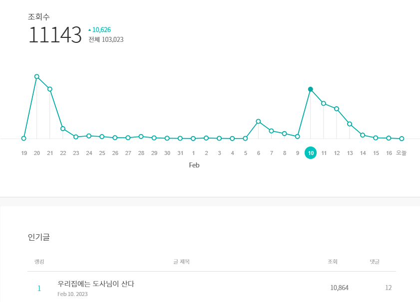 '우리집에는 도사님이 산다'라는 제목의 글이 2월 10일. 다음 동물 탭에 올랐다.