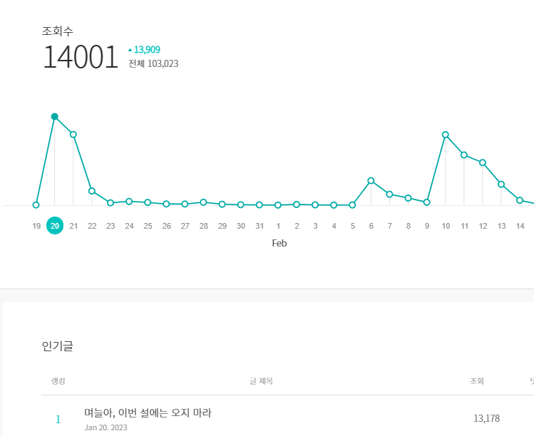 28일 저녁 노출을 시작으로 28일은 하루 내내 노출(물론 중간중간 글이 사라졌다 다시 나타났다를 반복)이 되어 약 3일에 거쳐 다음에 노출되었다. 조회수는 7000 ~ 14000 정도. 통계에서 기타 유입으로 잡히는 것이 그것이다.