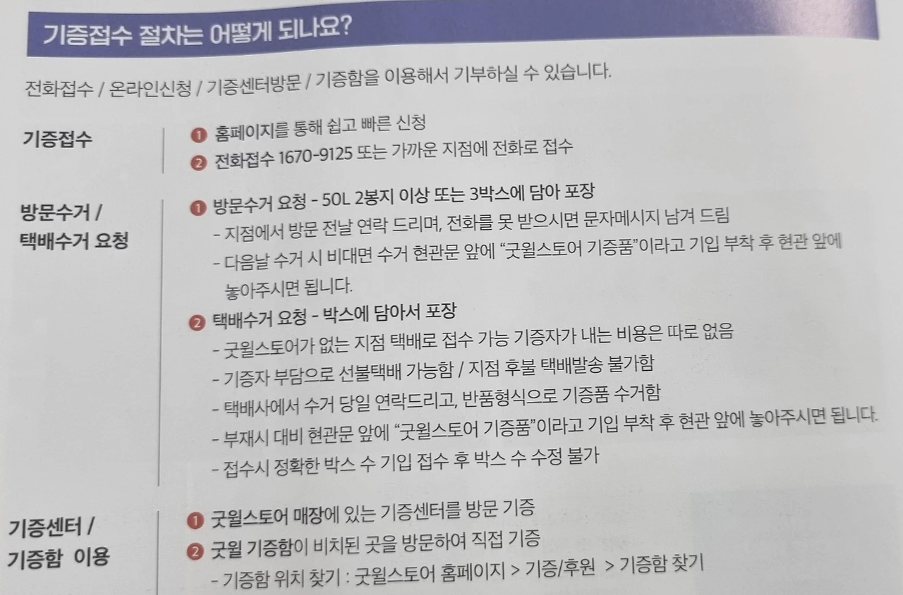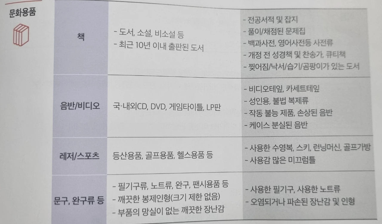 기증 가능 물품 안내 문화용품 등이 안내되어 있다.