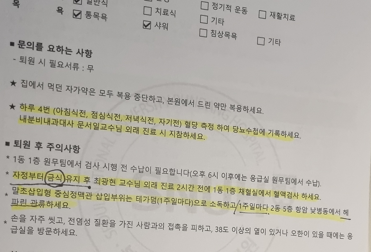 당뇨약으로 잘 조절되고 있는 아버지셨지만 의사 선생님은 주사로 직접 주입하는 치료법을 알려주셨다. 항암 치료 중 당뇨도 주사로 치료하는 것에 대한 부담감을 아버지께서 말씀하시자 약으로 조절하되 매일 공복 혈당을 기록하며 혈당 수치가 급격히 오른 경우 바로 병원으로 와야한다고 하셨다.